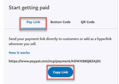 - Click on the Copy Link button to copy the link in the Pay Link tab. You wil need this link to begin integrating the button you created to your website.