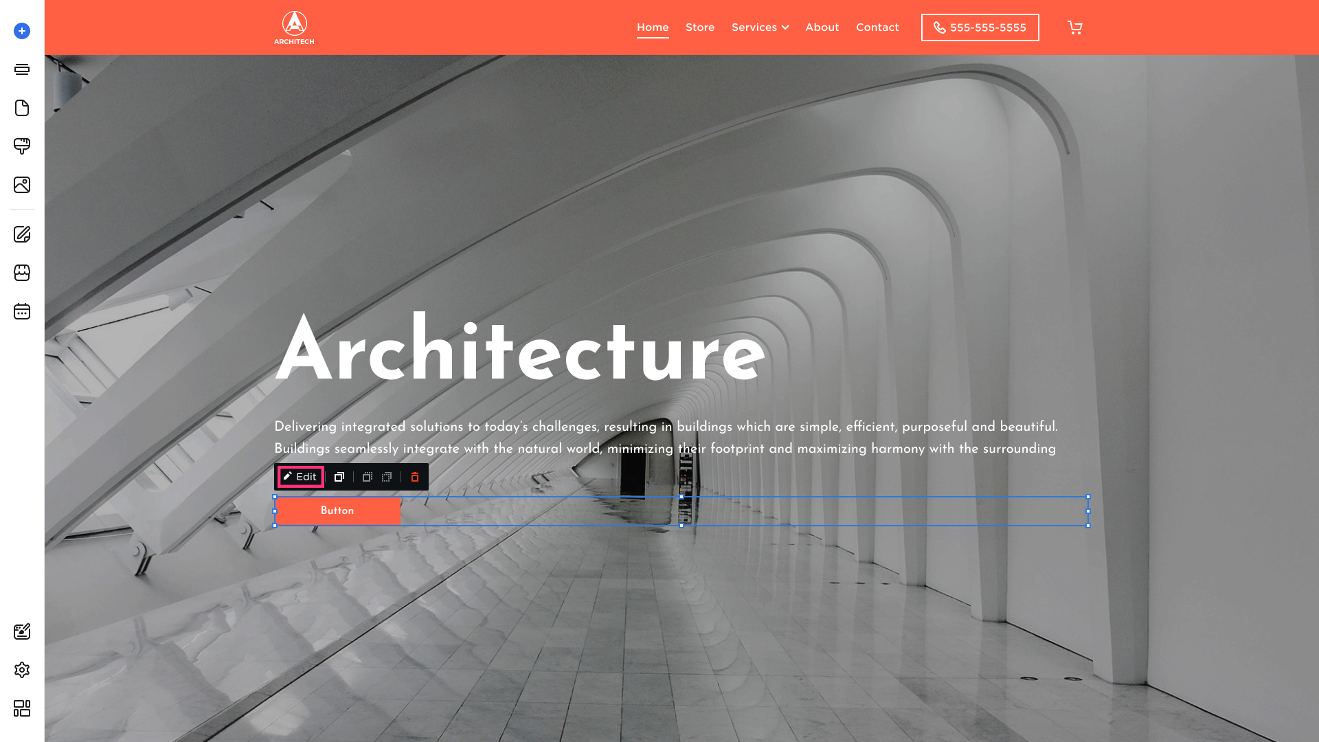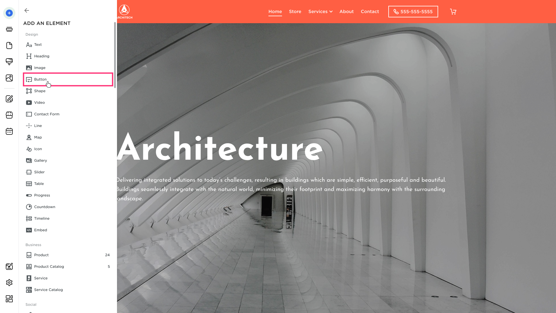 - In the Website Builder, add a Button element by clicking the Build (+) button, dragging it to the desired section, and dropping it using the grid: