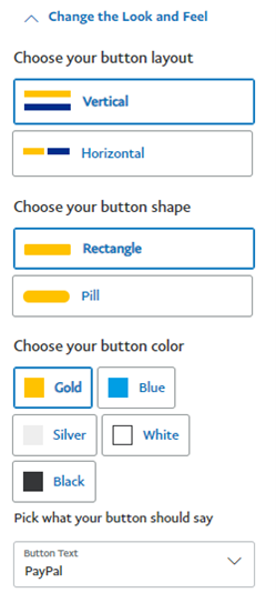 Change the Look and Feel – Click the drop-down button to choose which layout, shape, and color you want to use for your button. Click on the Button Text drop-down menu to choose which text you want to show to the button.