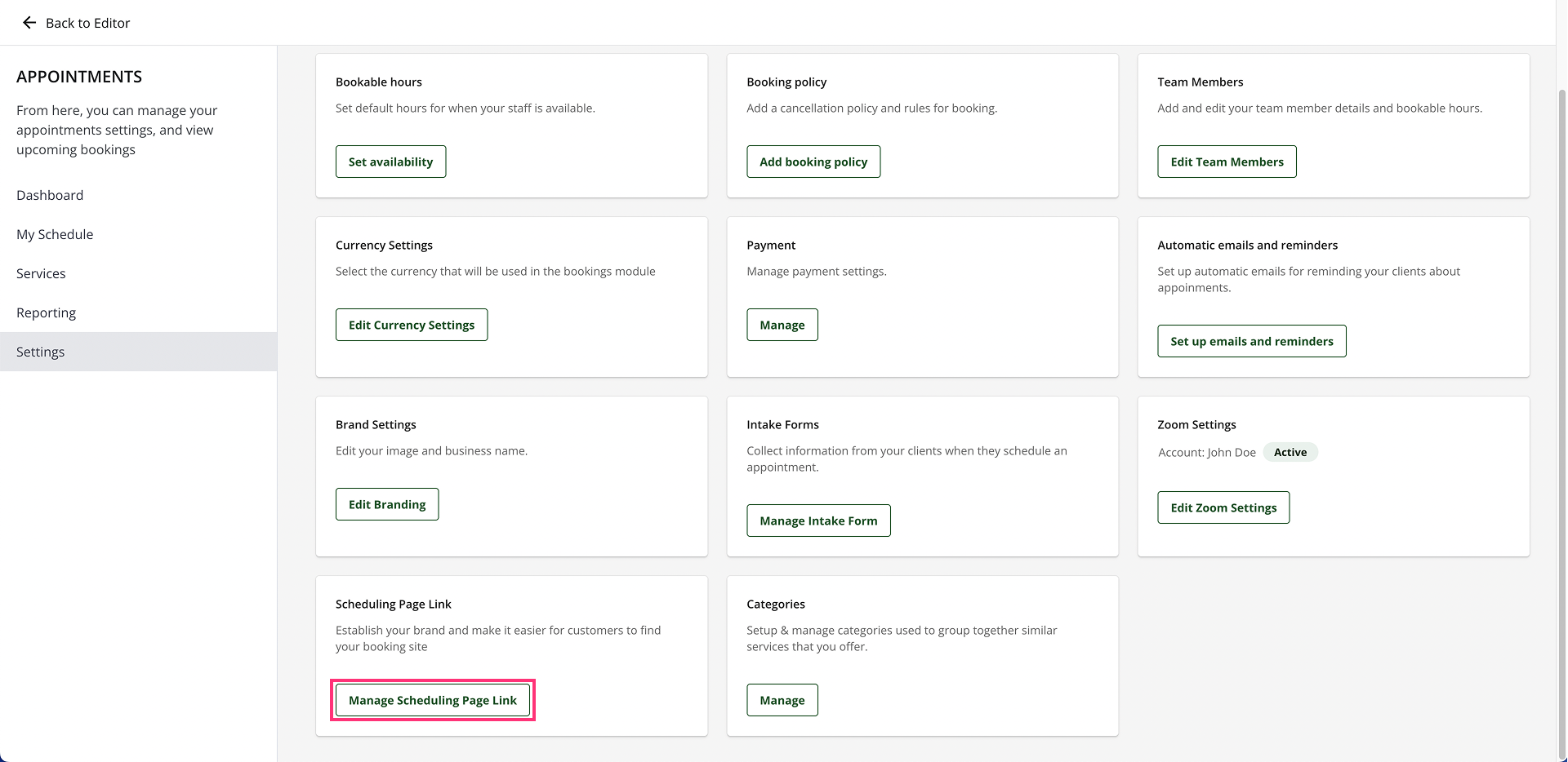 - Select Settings in the left sidebar, click the Manage Scheduling Page Link button: