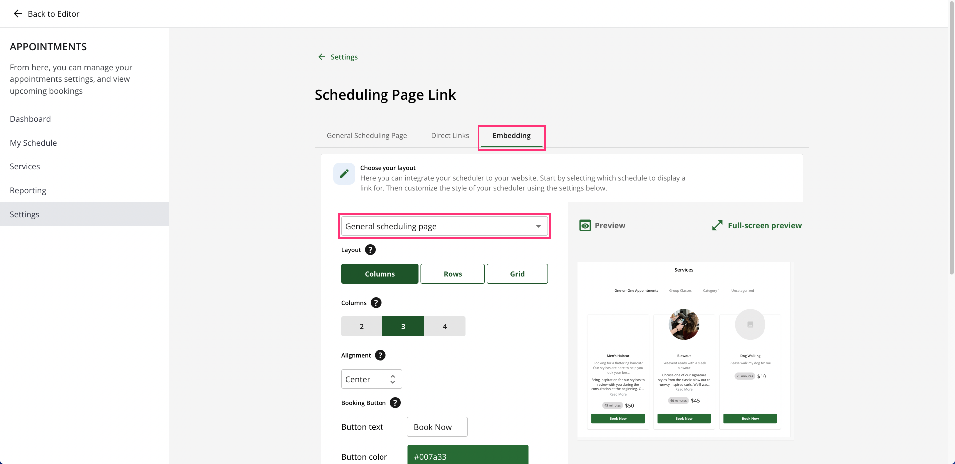 Please Note: While editing your scheduling page, you will see a Preview on the right to see how your page will look on your website when successfully added.