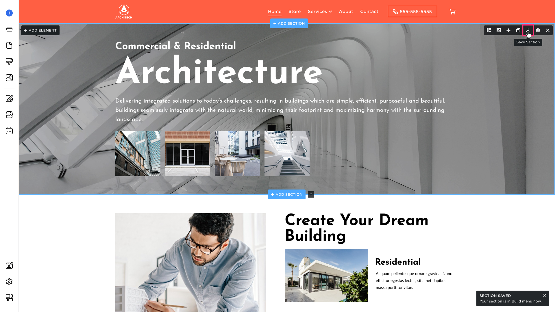 The Section Creator functionality allows you to save favorite sections and reuse them as often as you need across all your websites. To save a section, you need to enable the Section Creator functionality in the Site Editor Settings.
