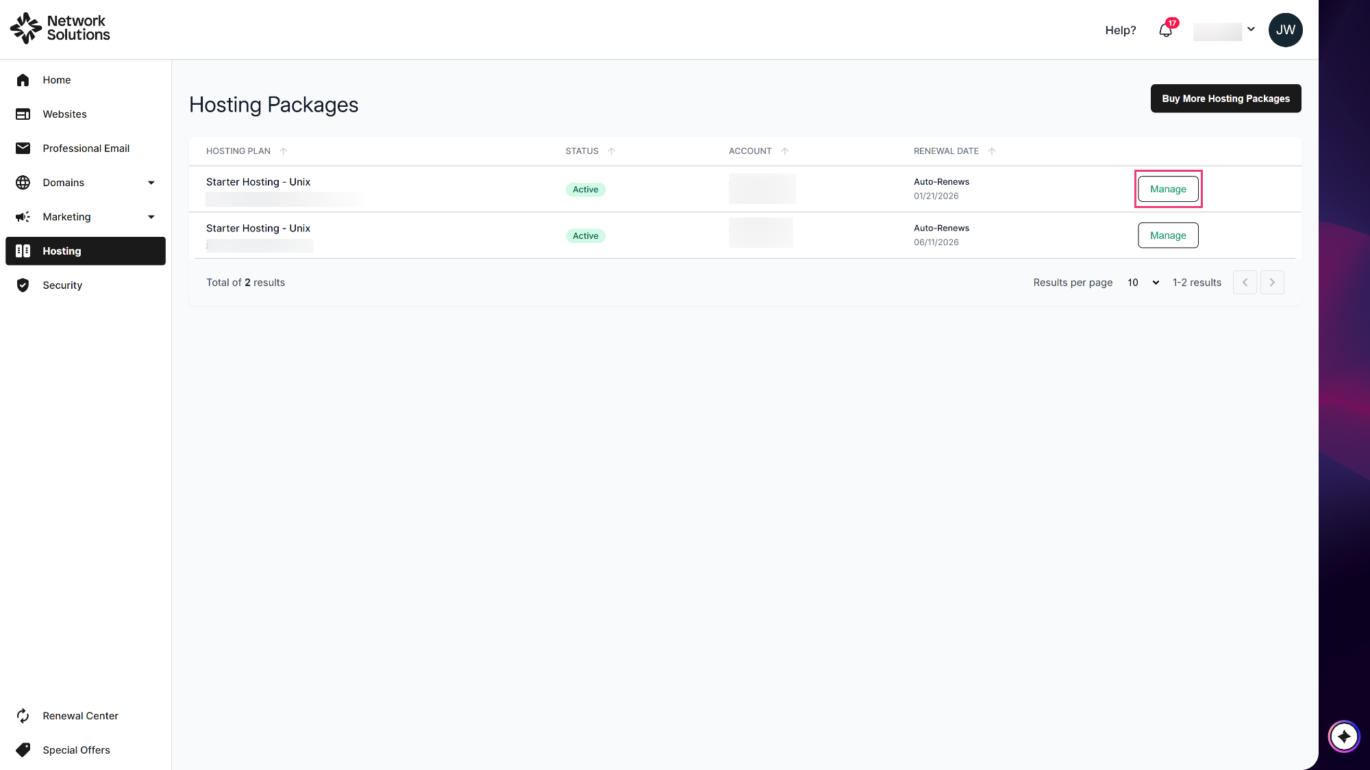 - If you have multiple hosting packages in the account, select a package first, then click the Manage button. If you only have one package on the account, continue to step 4.