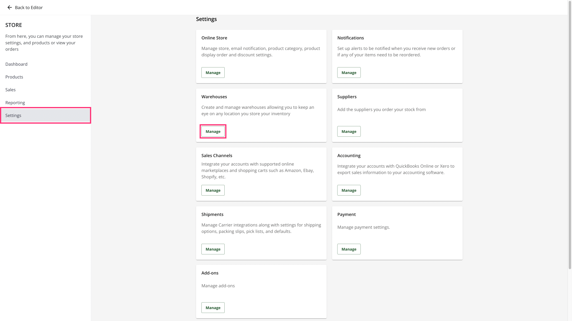 - Then select Settings, look for the Warehouses card and click the Manage button.