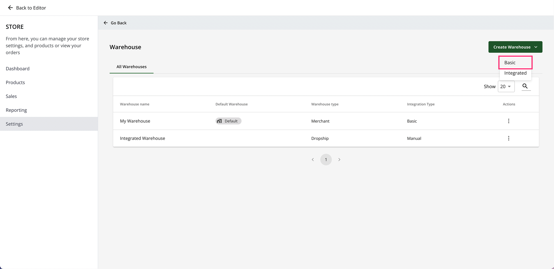 - Click the Create Warehouse drop-down on the upper right side of the Warehouse page.