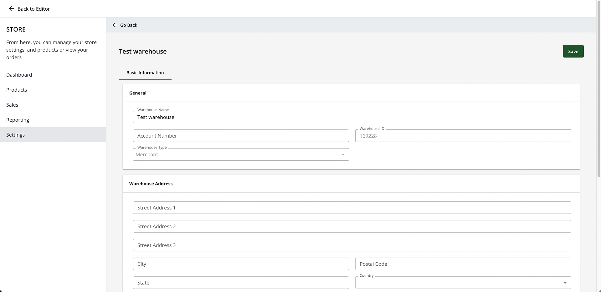 - In the Warehouse Address section, enter the Street Address, City, Postal Code, State, and Country.