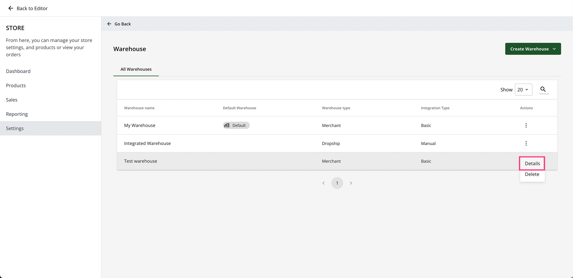 - Click the vertical ellipses on the right side of the chosen warehouse and select Details.