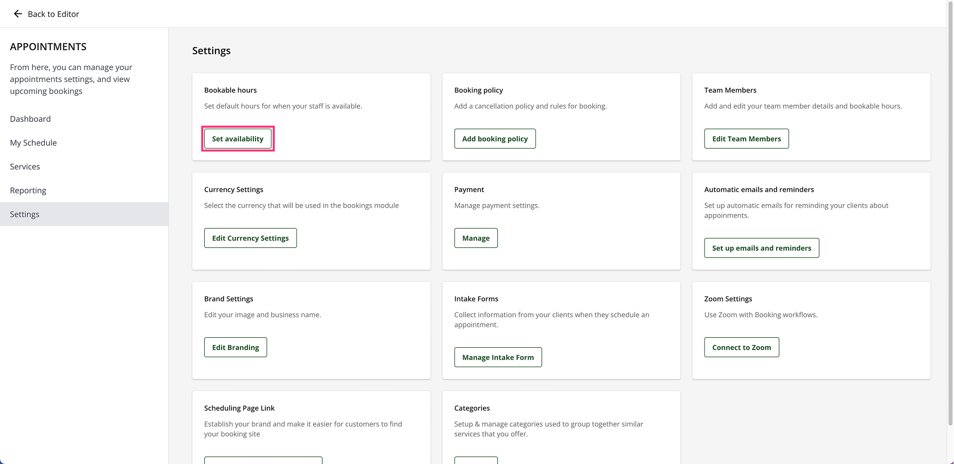 - On the Settings page, find the Bookable hours card and click on the Set availability button.
