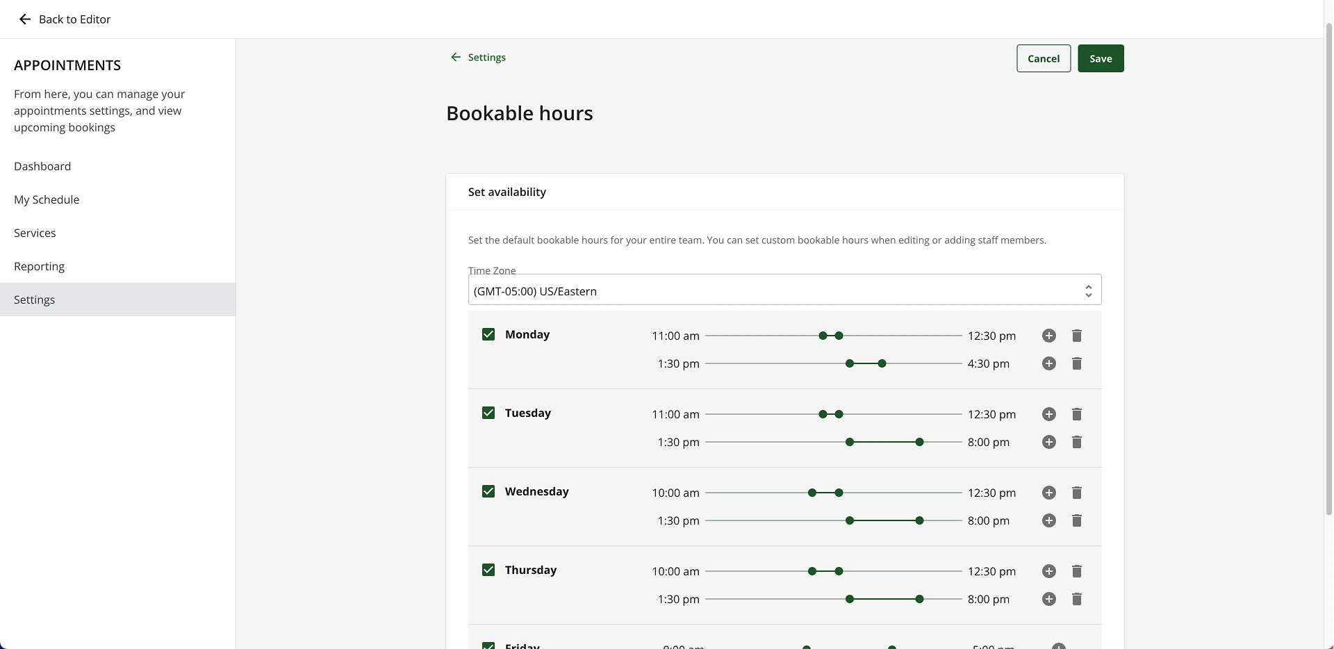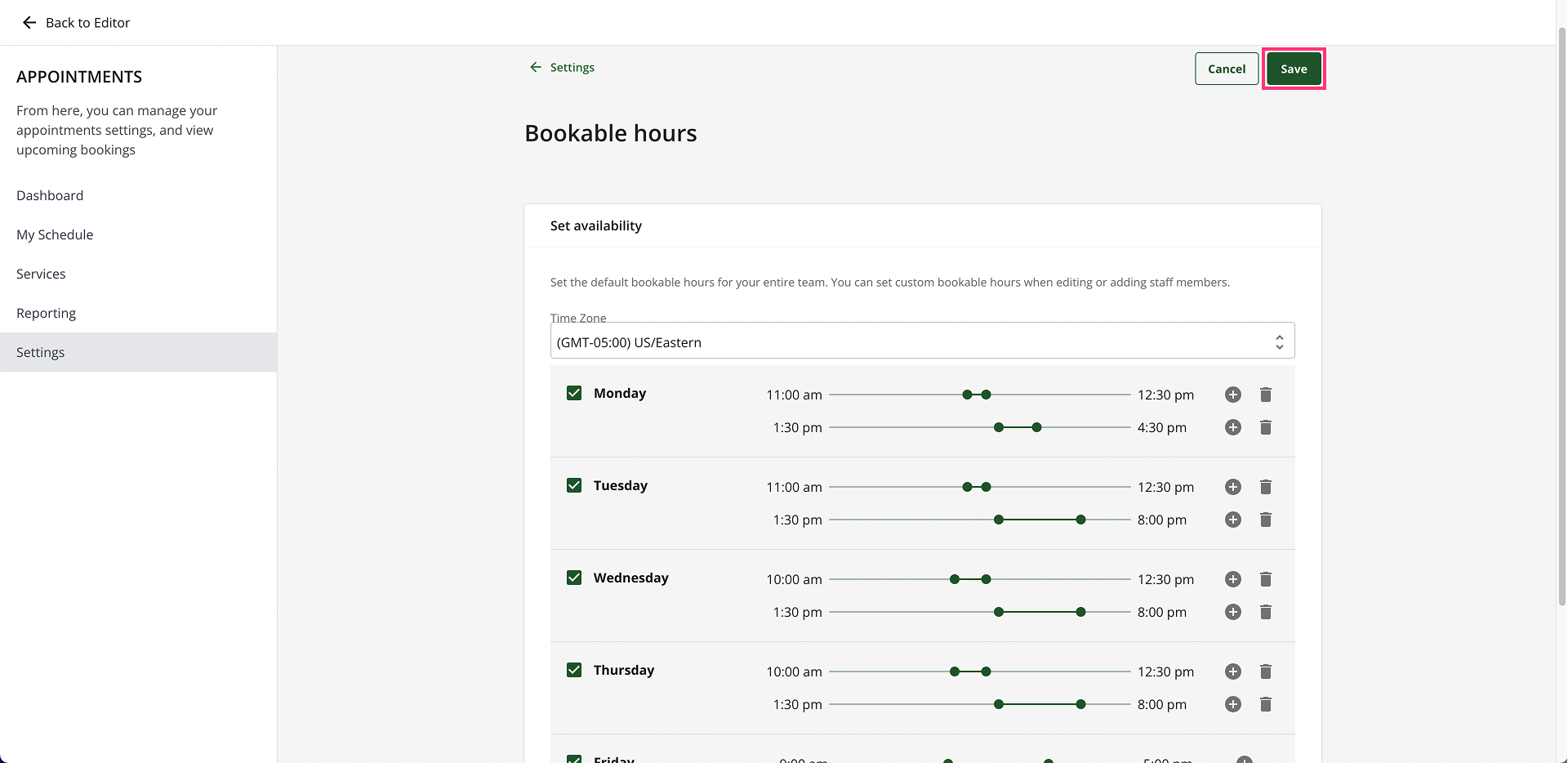 - Adjust or set the time of your available bookable hours.
