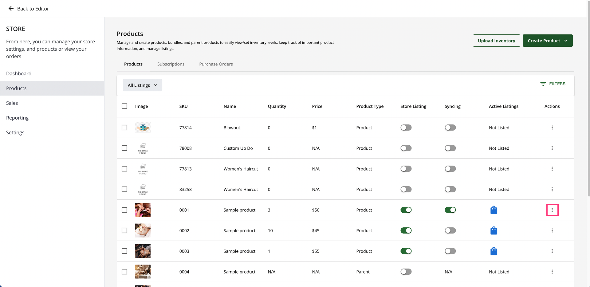 - In the Products section, locate the product listing and click the vertical Action ellipsis (⋮):