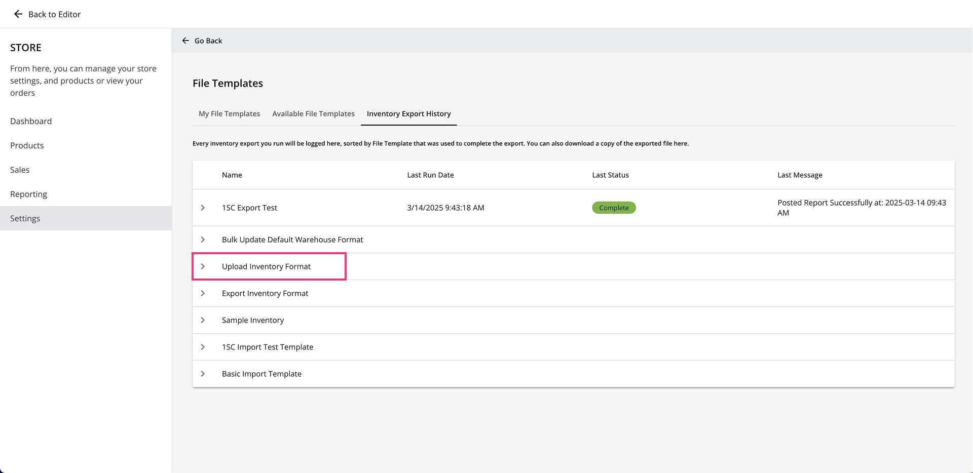 - Navigate to the Inventory Export History tab and check the Upload Inventory Format report (or a custom template you used for the inventory import).