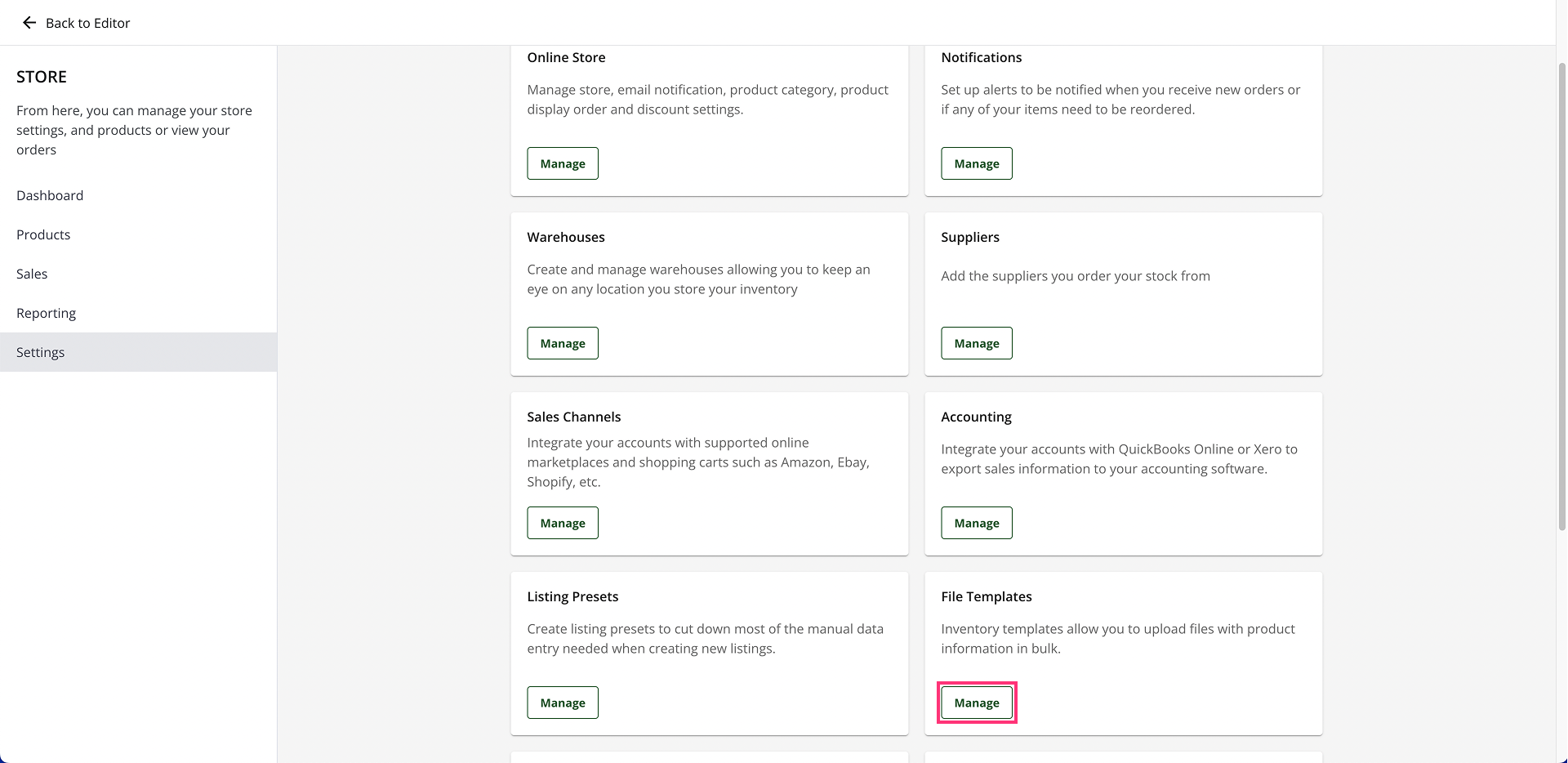 4. Navigate to the Settings section. If Bulk Editing Tools aren't activated in your eCommerce, click Manage on the Add-ons card. If Bulk Editing Tools are activated, skip to step 7.