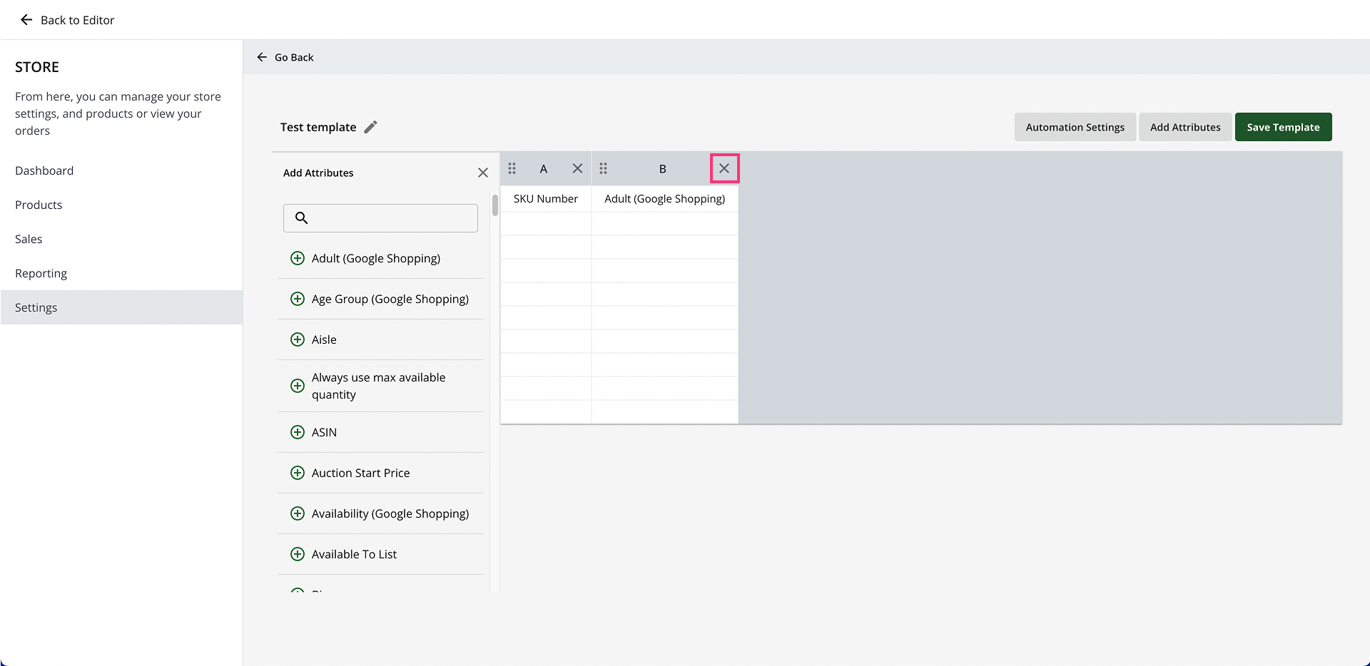 7. Delete an attribute by clicking the ✖ button on the corresponding column header if needed: