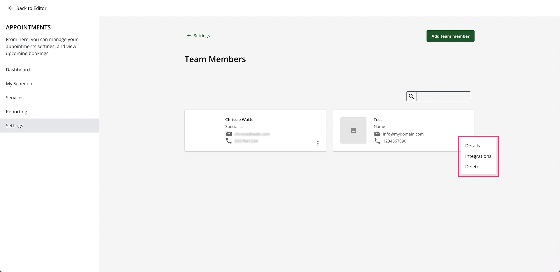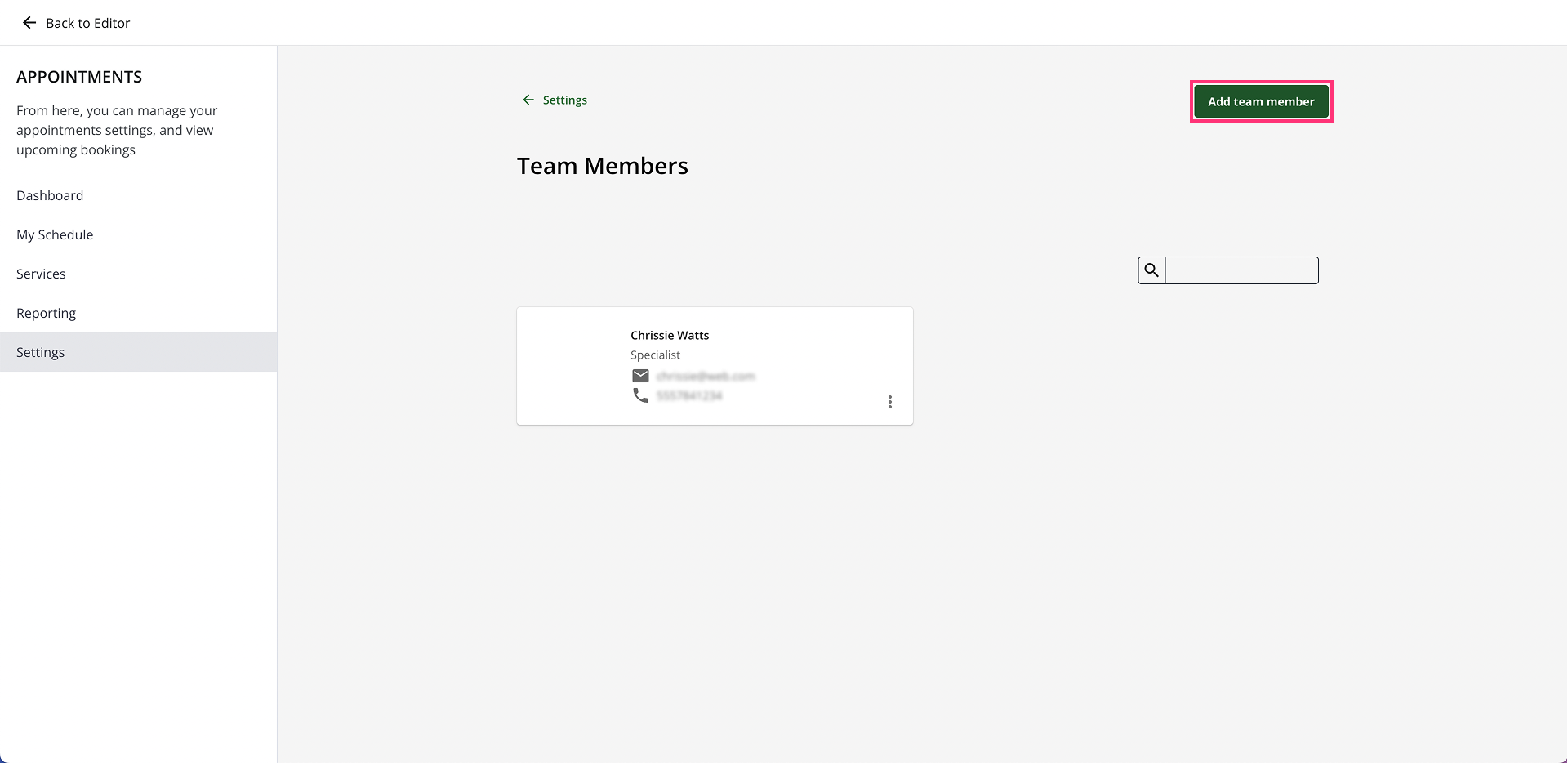 - Add the team member's Name and their Services, then click Save.You can also add the team member’s Job Title, Email Address, Phone number, and Photo.