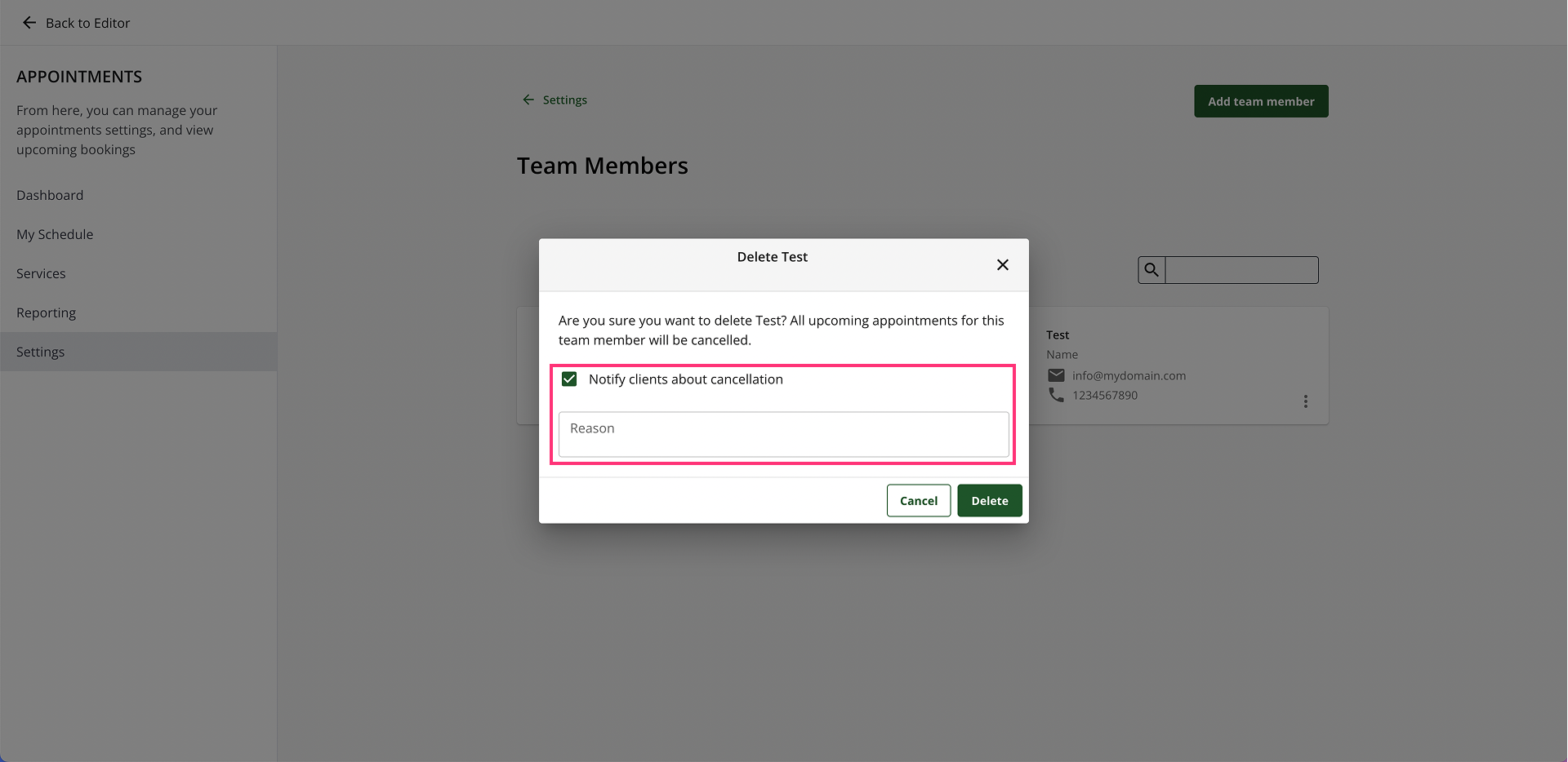 Next, you will see a pop-up to confirm that you are deleting the team member with the option to notify any clients with booked appointments assigned to that team member. Tick the checkbox to inform the clients about the cancellation of their appointments.