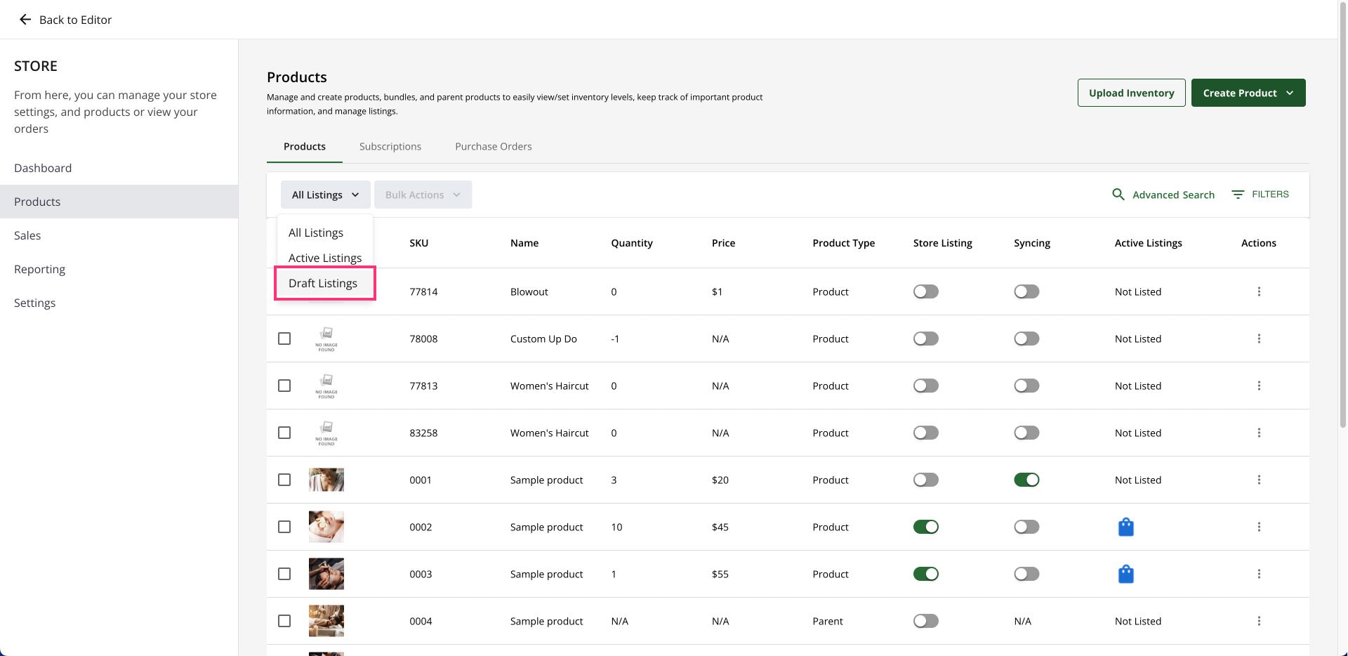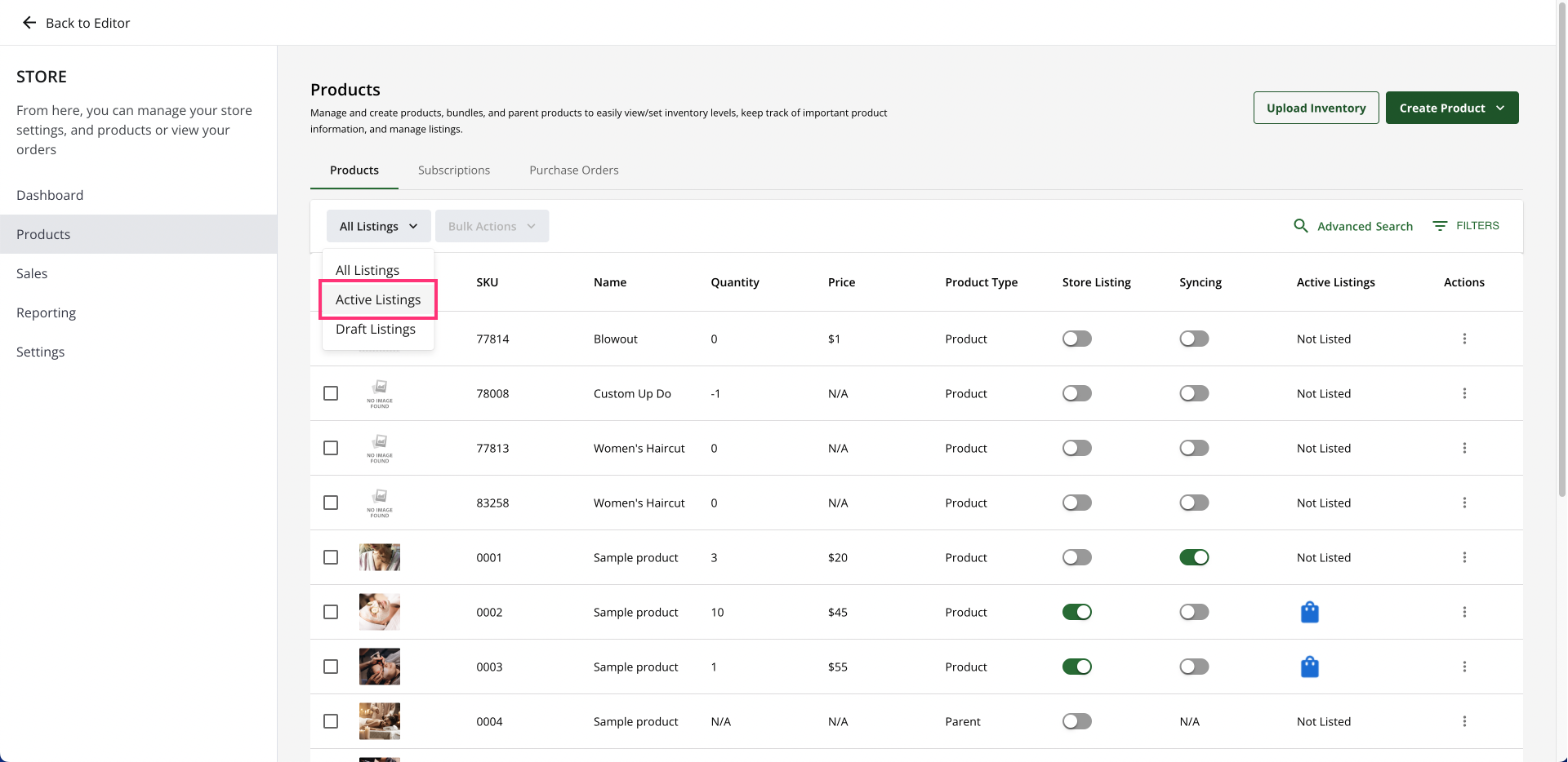 - Navigate to the Products section. To access your Online Store Active Listings, click the All Listings dropdown and select Active Listings: