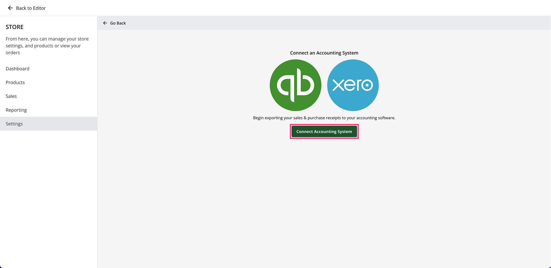 - Click the Connect Accounting System button: