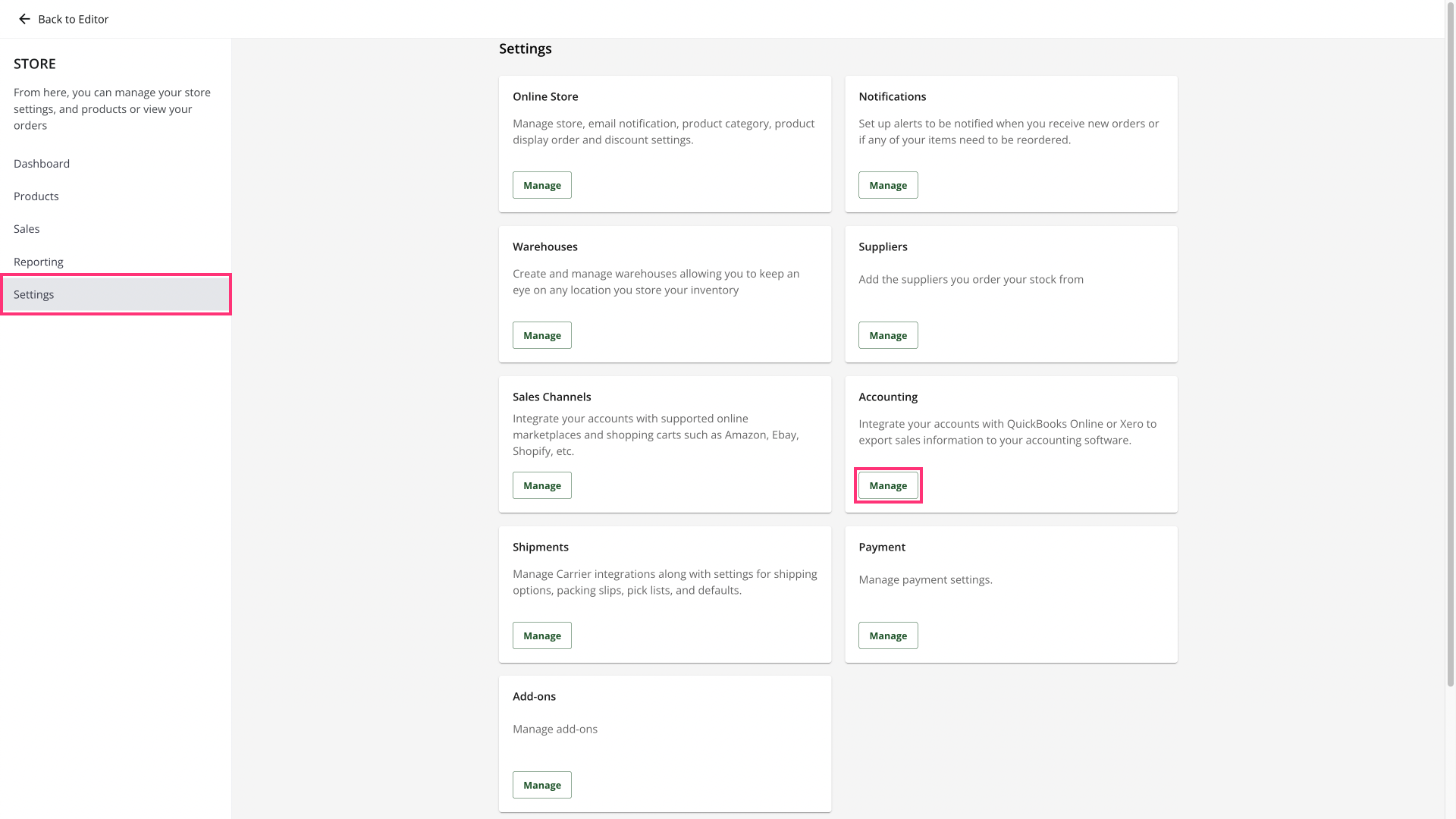 - In the Settings section, look for the Accounting tile on the right, then click Manage: