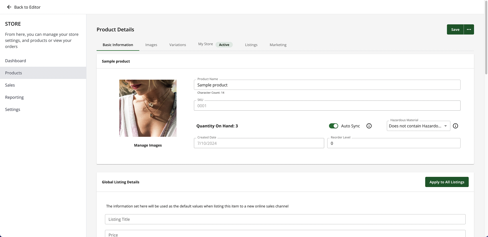 - Review all the details on the Product Details page and make necessary updates to the information. You can edit the Product Name, SKU, product quantity and more on the Network Solutions store: