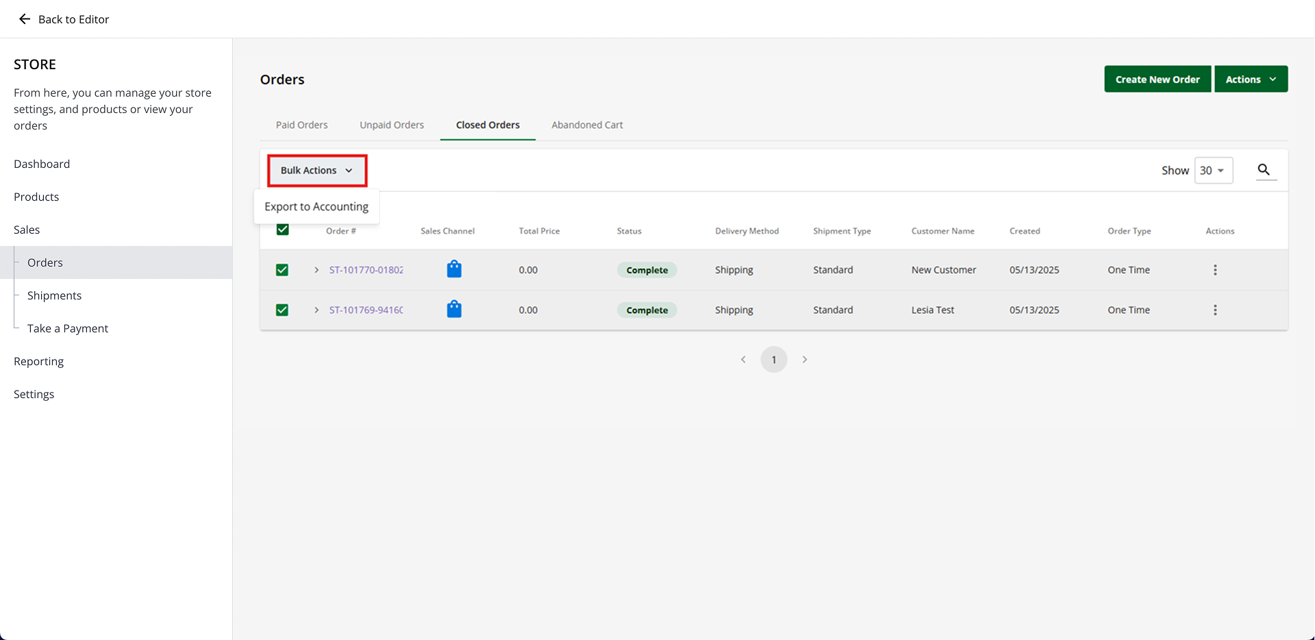 - Once orders are selected, click the drop-down icon next to Bulk Actions and select Export to Accounting.