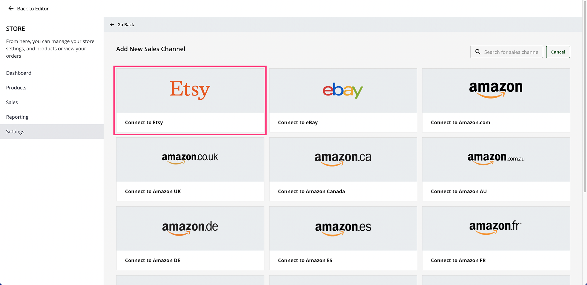 - You will see the different sales channels. Click Connect to Etsy under the Etsy logo.