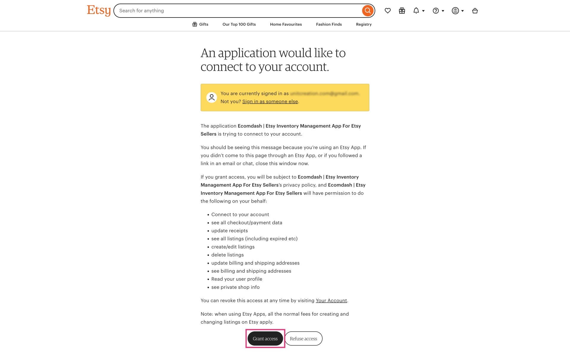 - Click Grant Access for ecomdash, our eCommerce dashboard integration app. Etsy will prompt you with a success message and a code.