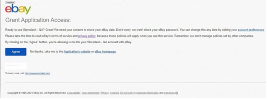 - You will receive a Grant Application Access message. If you agree to grant Network Solutions' eCommerce dashboard access to your eBay account, click on the Agree button:
