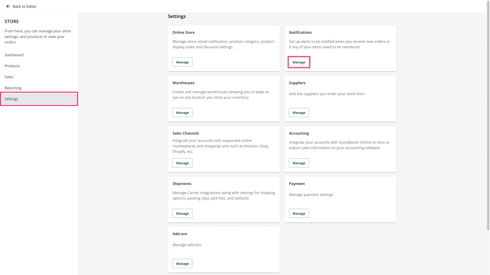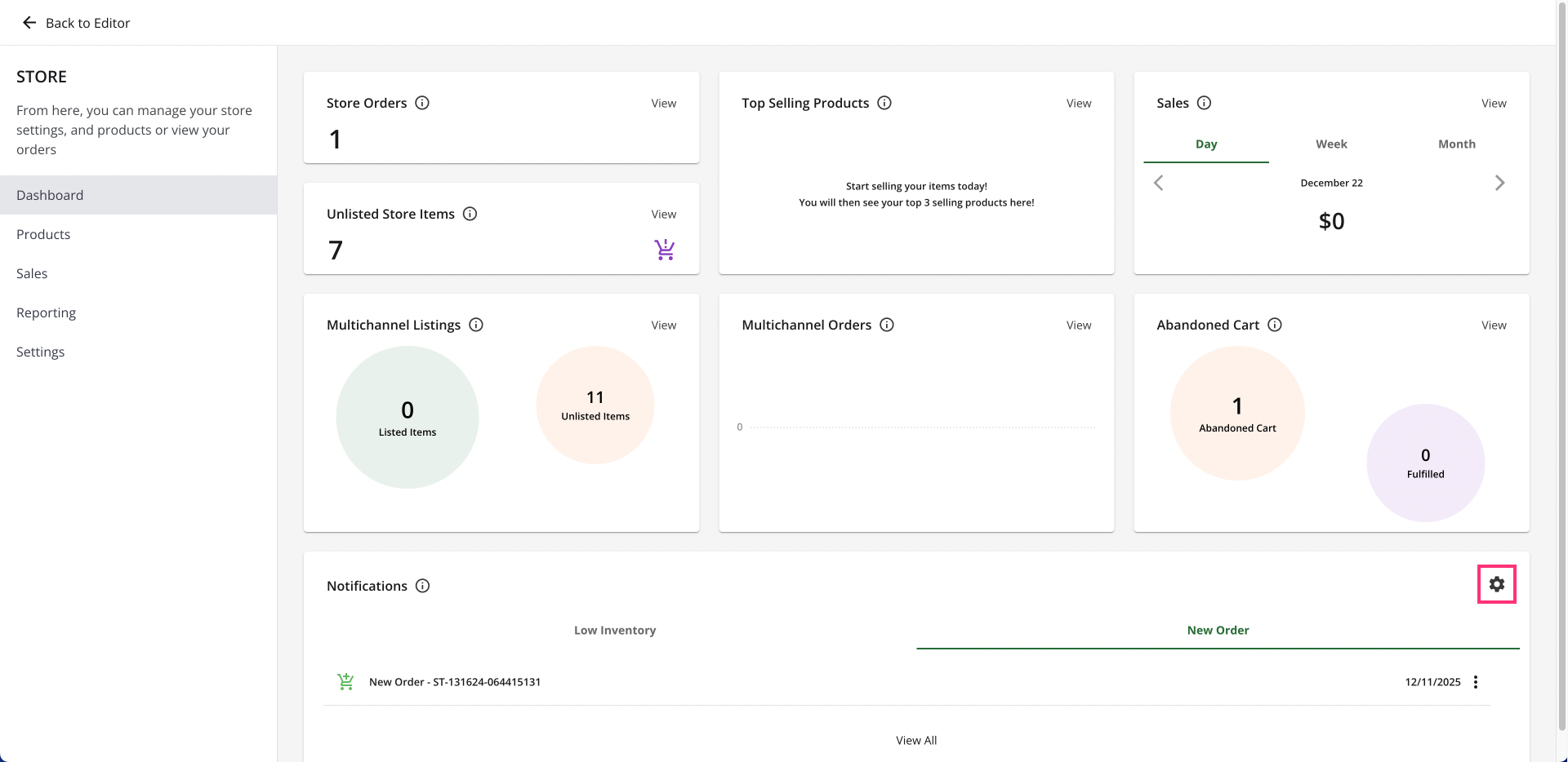 - Alternatively, you can also enable your Low Inventory Notifications within your Store Dashboard by clicking on the gear icon within the Notifications tile.