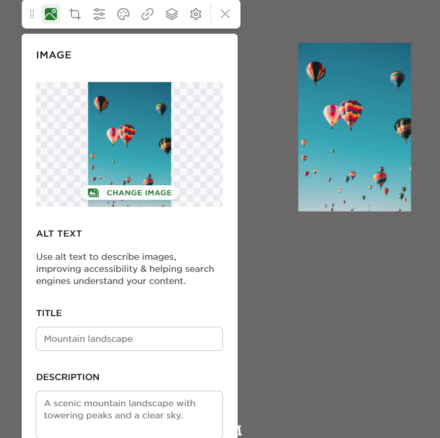 Once you have added a photo in your Website Builder, you can add Alt Text by clicking on the Advanced options and selecting Alt Text.