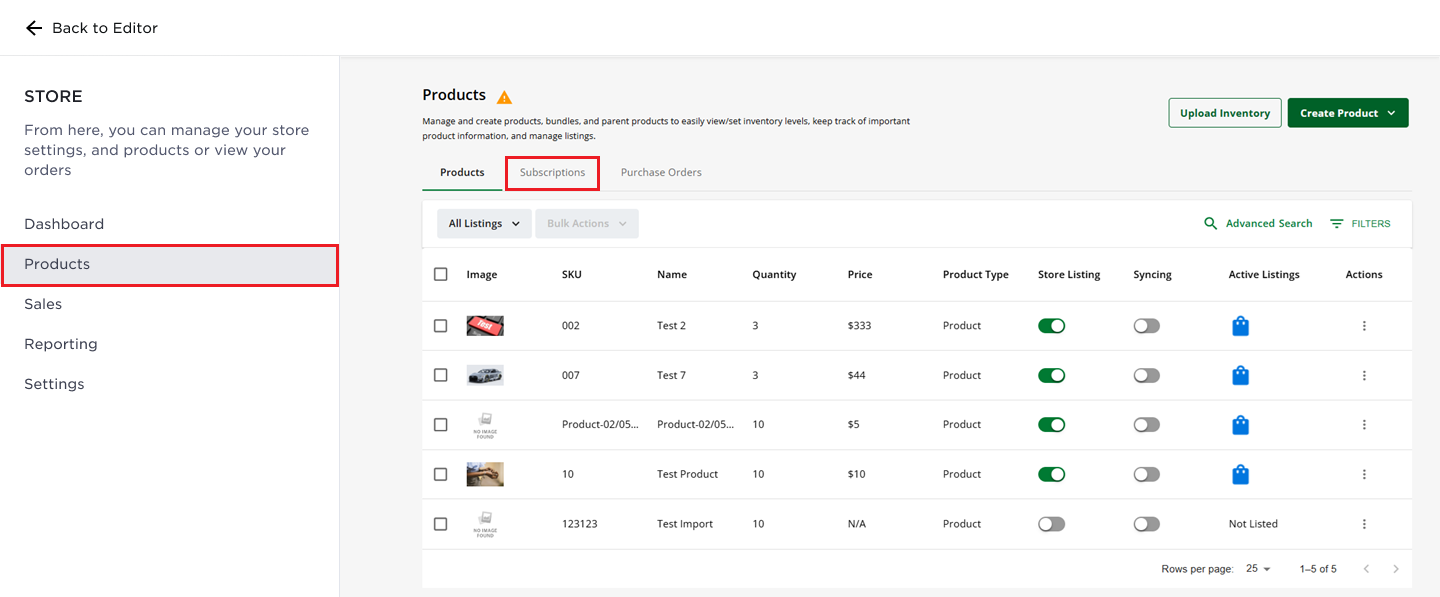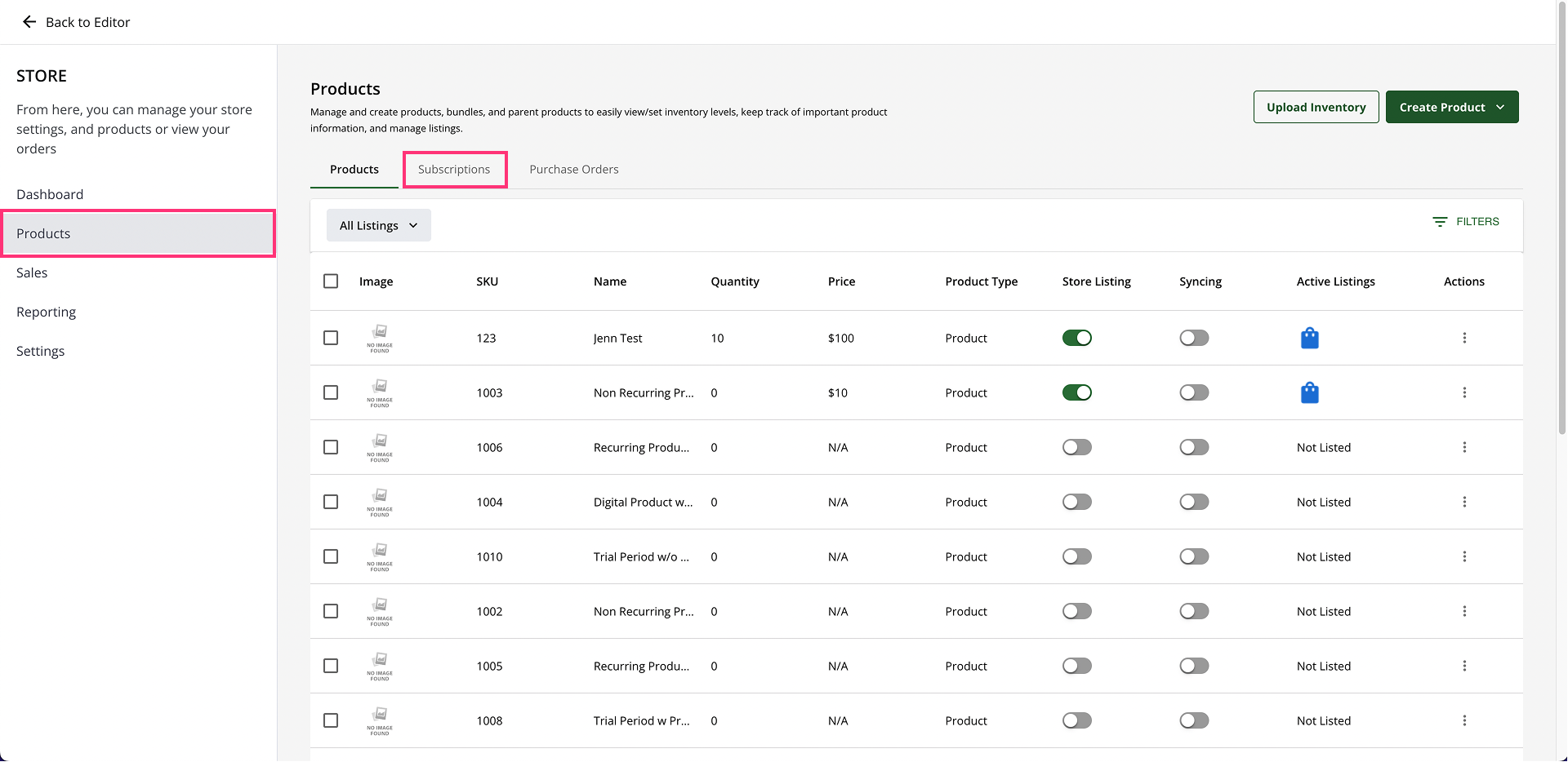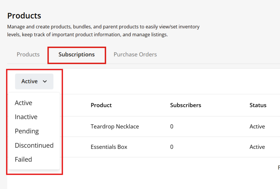 - Choose Products from the drop-down menu and proceed to the Subscriptions tab.