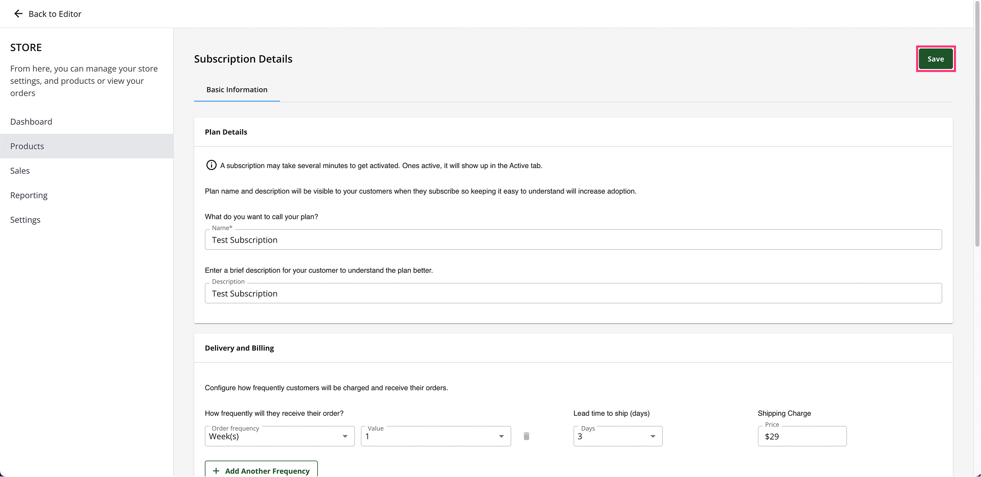 - Delivery and Billing – Set up the frequency of the order and the shipping cost associated with it.