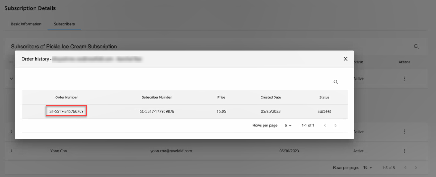 - Click the vertical ellipsis next to the subscriber you want to manage and choose Order history, as seen in the image below.