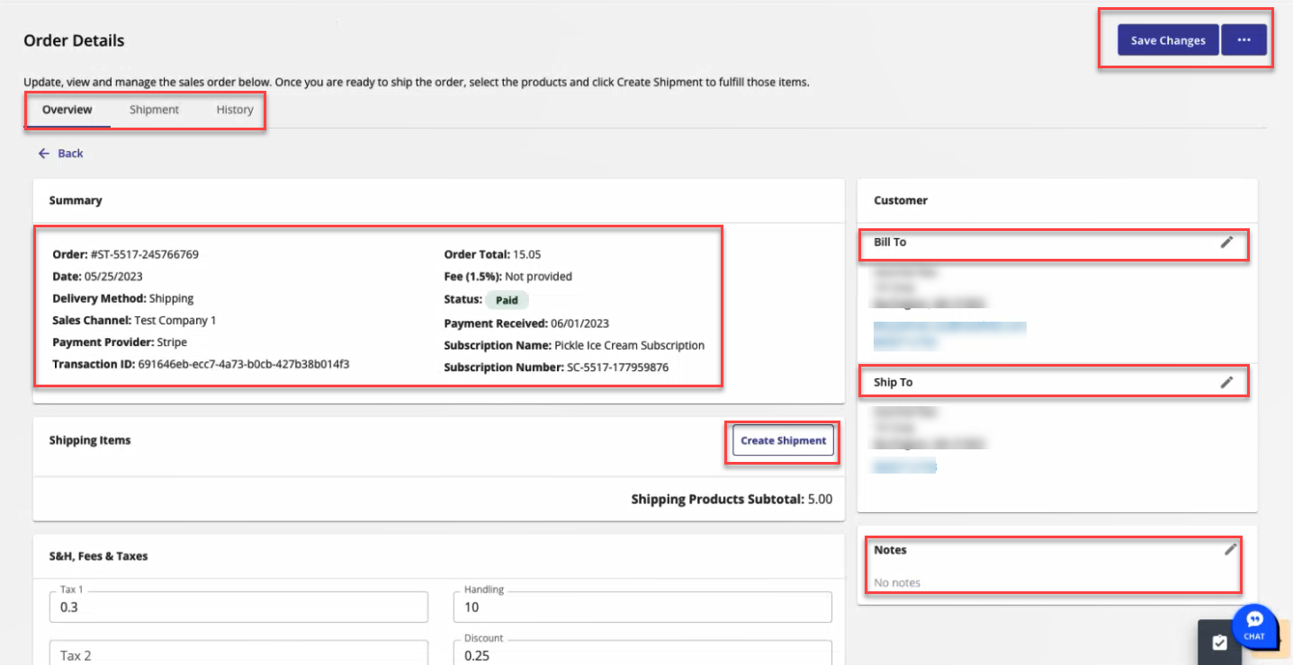 - On the Order Details page, you can view the order, create a shipment, view the fees, edit the customer’s information, and more. Click Save Changes when you’re done.
