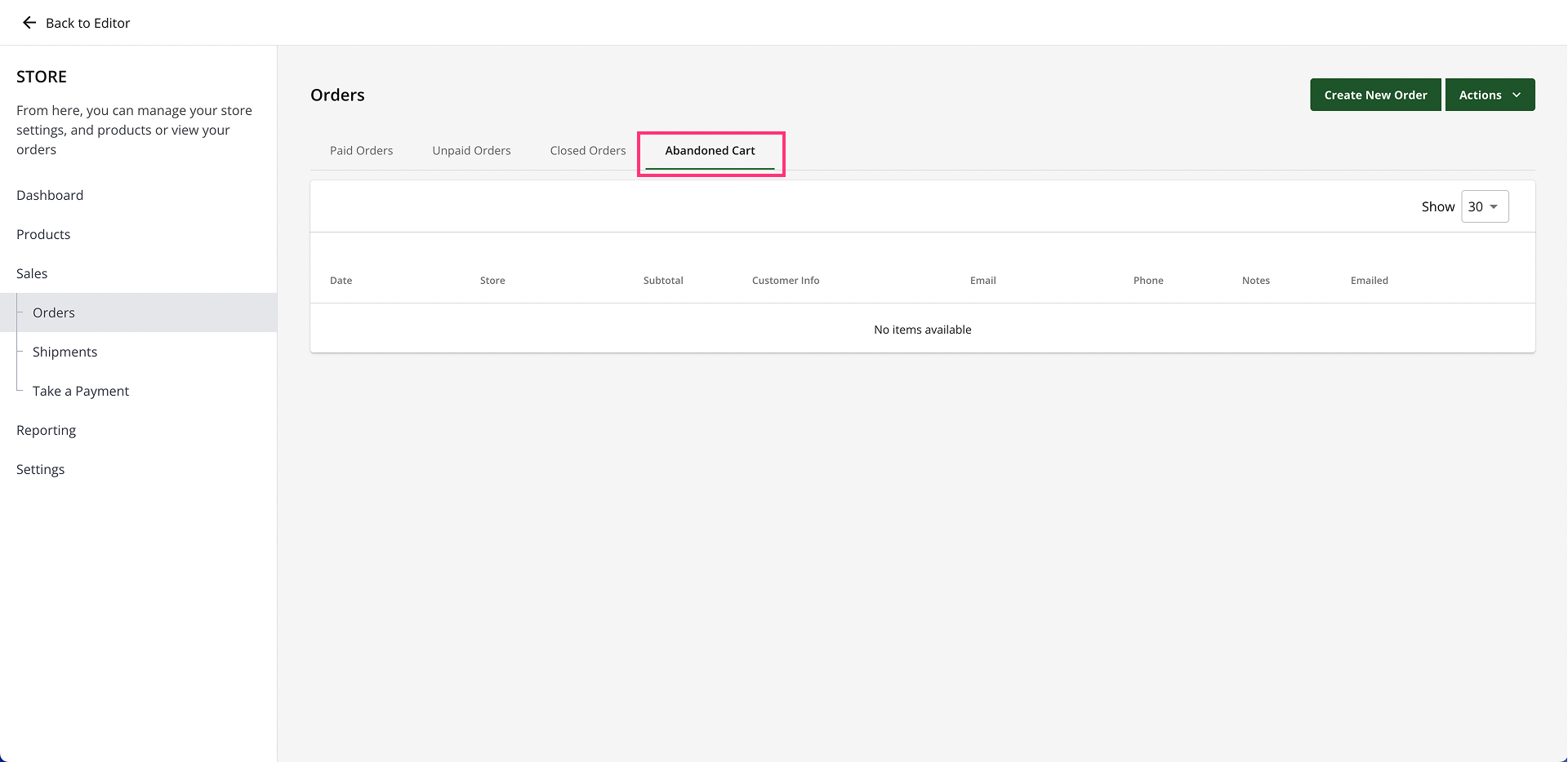 - You will automatically be taken to the Orders page. Click the Abandoned Cart tab.