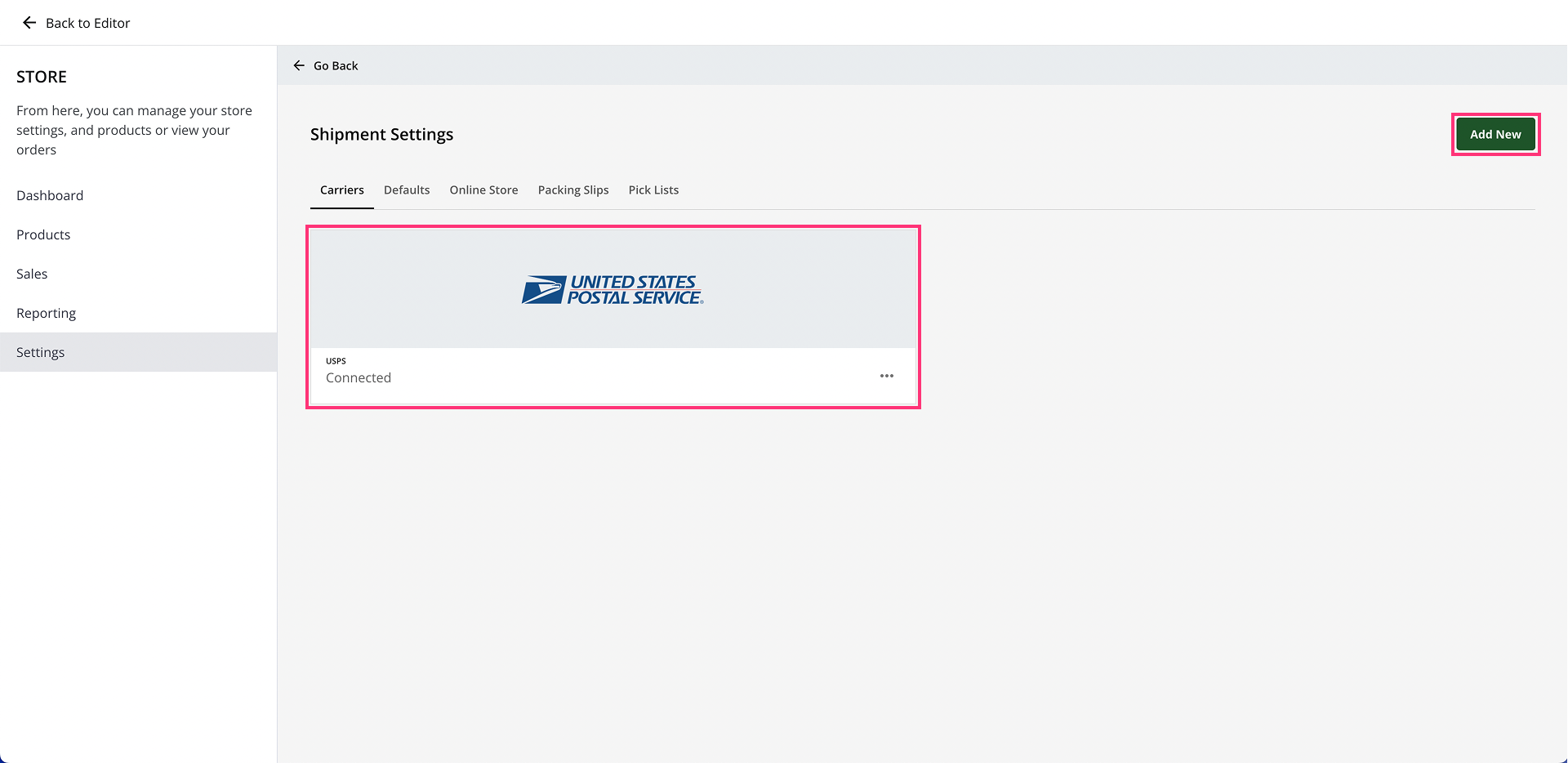 - On the Carriers tab, make sure you have USPS connected. Visit the article eCommerce: Add a Shipping Carrier for more help.