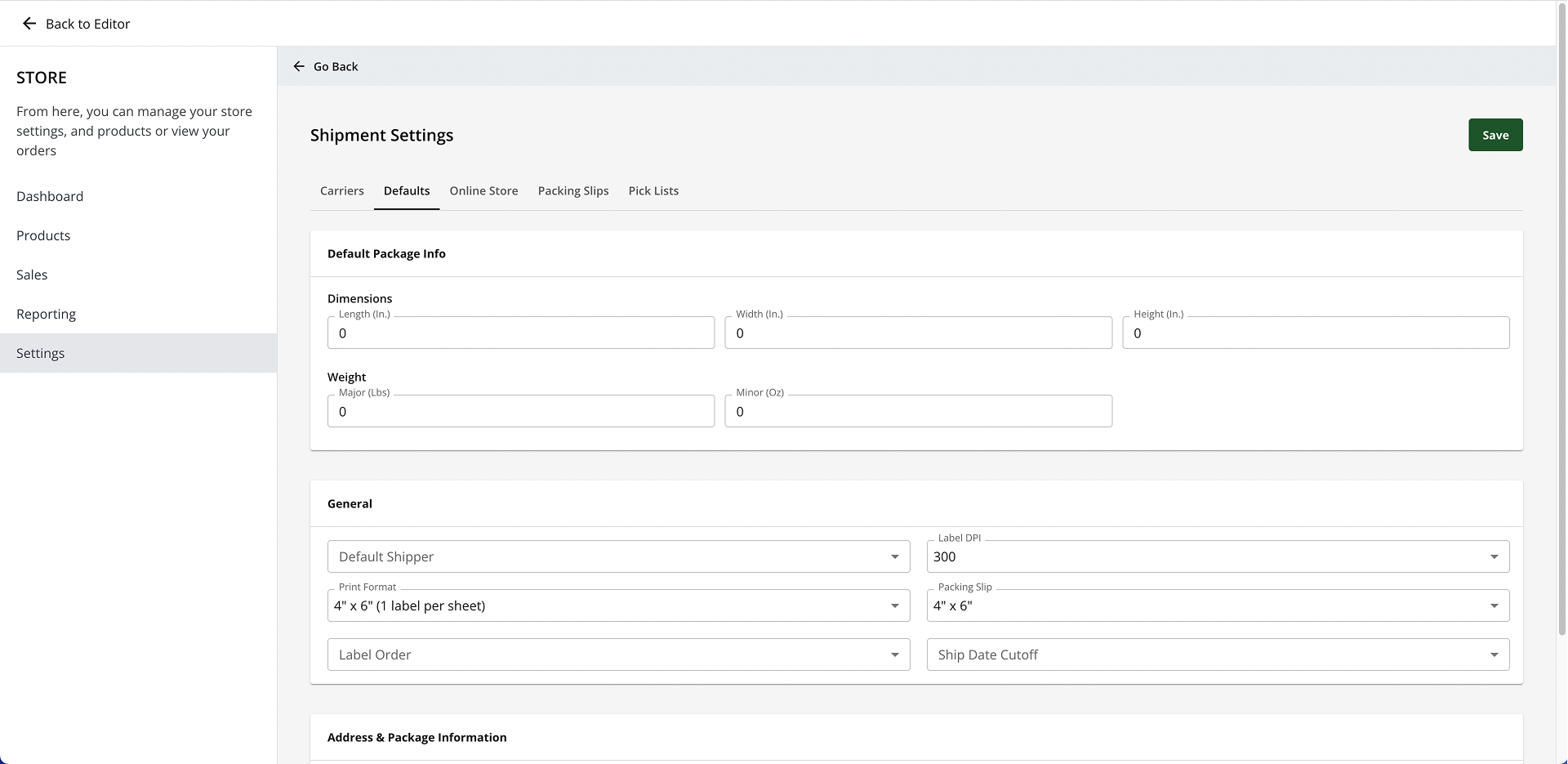 - Click on the Defaults tab to confirm that you have entered the default package dimensions (measurements used to calculate shipping if the product doesn’t have any set). You should enter the length, width, height, and weight. Visit the instructions on updating your inventory for help updating specific products.