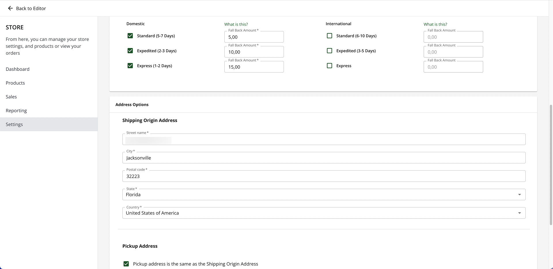 - Scroll down to Address Options and enter the origin address (where you’re shipping the product from).