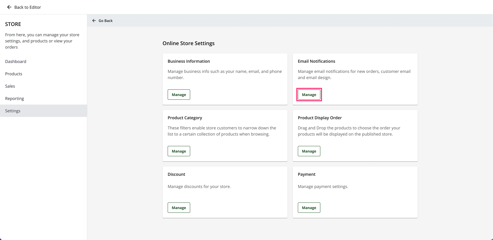 - Inside the Settings section, click the Manage button within the Online Store card.