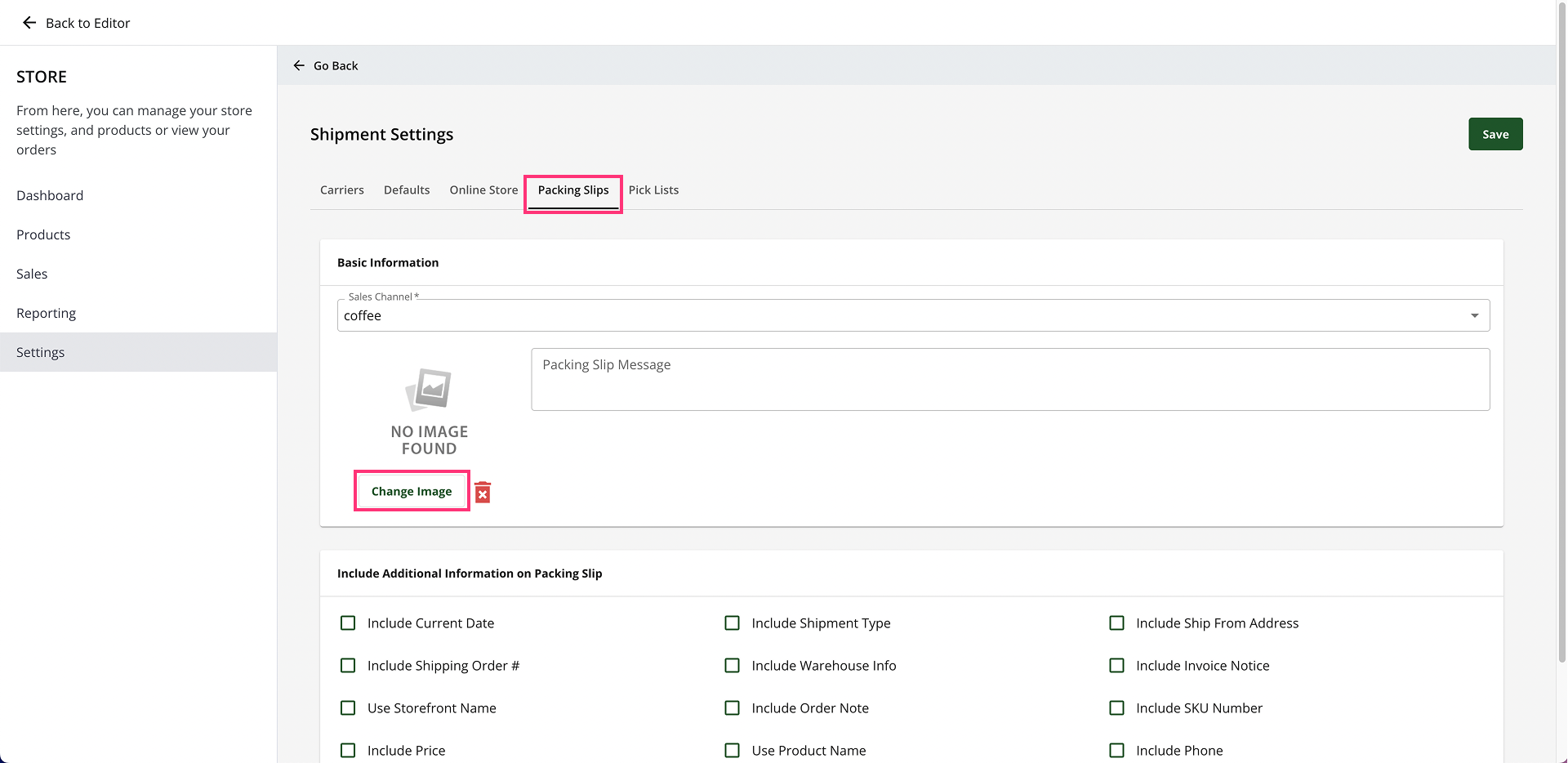 - Go to the Packing Slips tab. Click on the Change Image button to add your logo.