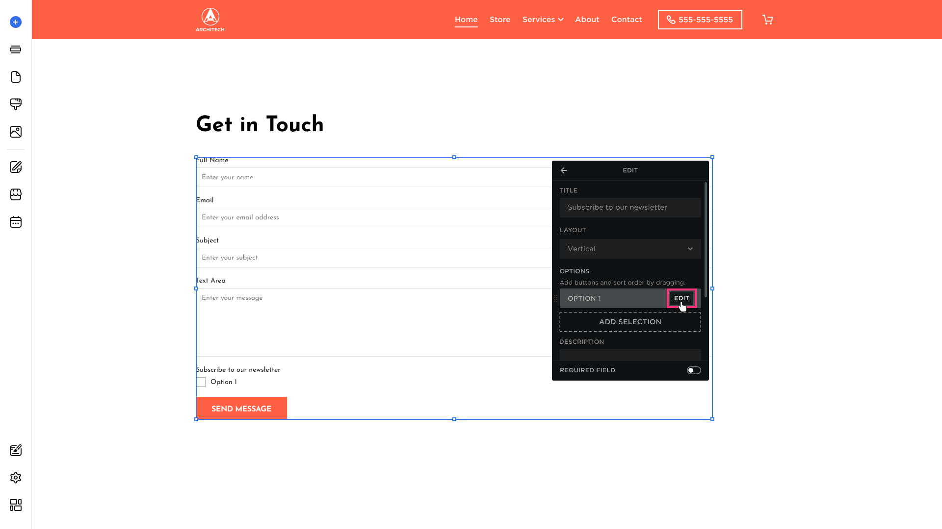 - Click on the contact form element and choose the Edit button that appears in its toolbar: