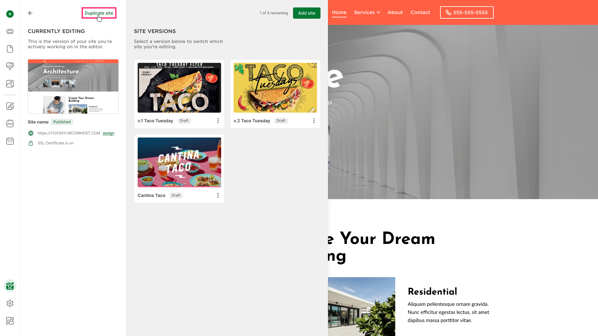 - To duplicate this version, click the Duplicate Site button on the top right of this section: