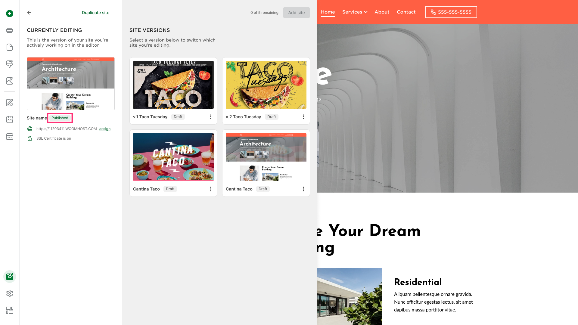 The Site Versions section shows all sites in your account. The site’s status (Draft or Published) will be indicated to the right of its name.