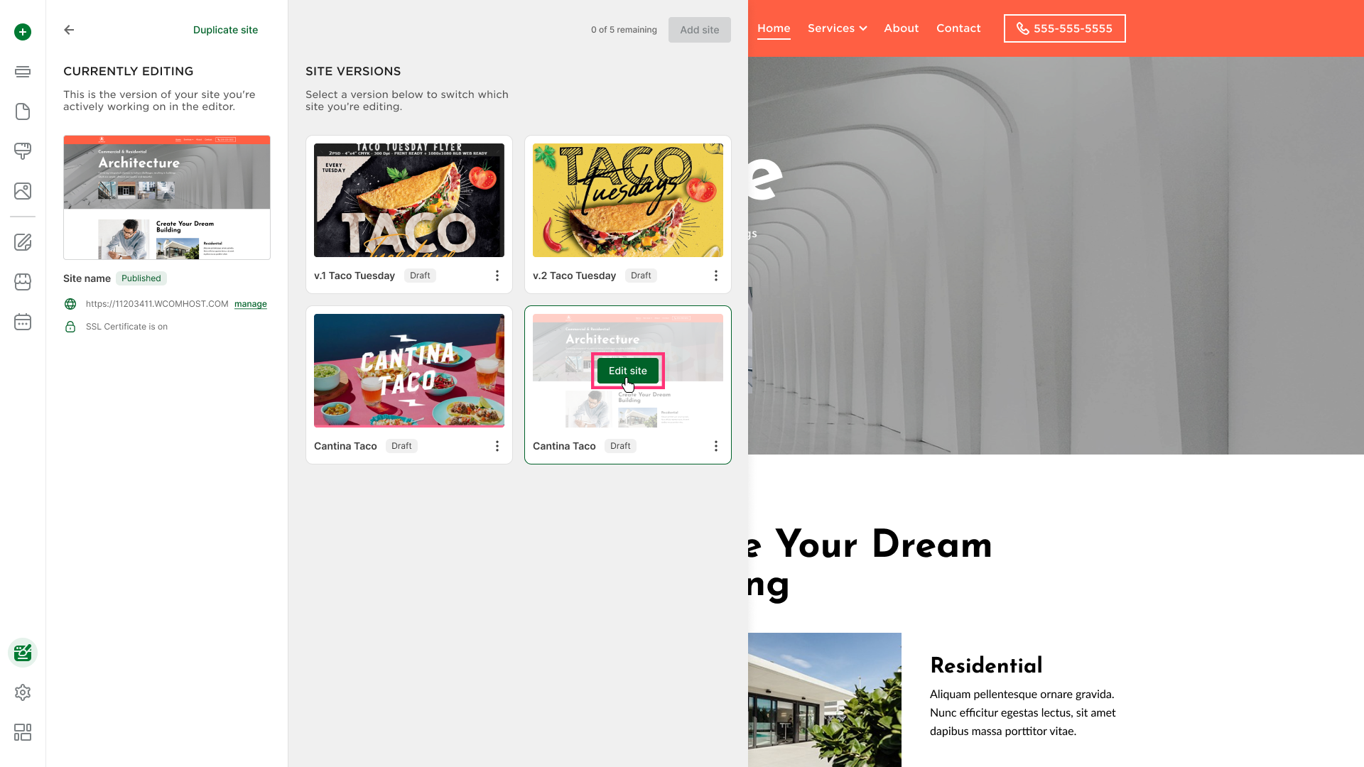 - To switch between your sites, hover over the version you want to edit and click the Edit Site button that appears:
