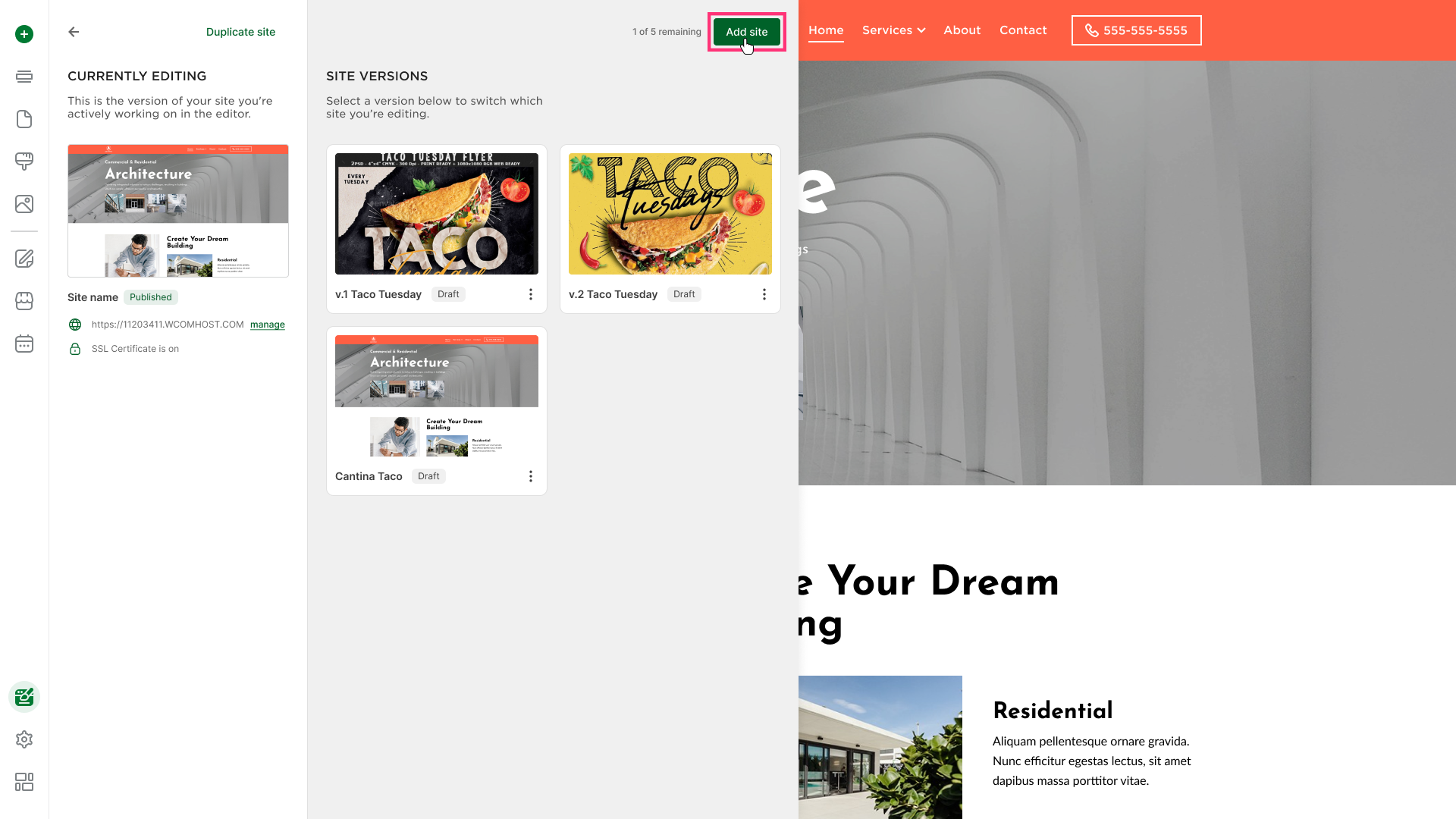 - To add a new site, click the Add Site button in the top-right corner. The number of available site versions is shown on the left of the Add Site button:
