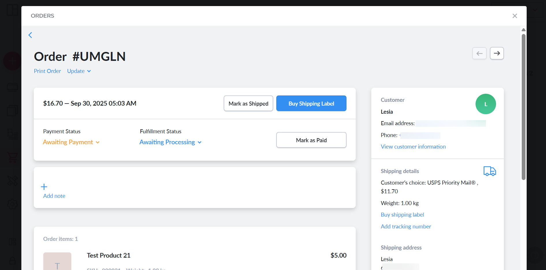 - If you want to update the order status to Shipped and send an email to a customer immediately after buying the shipping label, tick the Mark order as shipped and notify the customer by email checkbox on the right-hand side. If you want to change the order status to Shipped manually after you’ve actually shipped the product, untick the checkbox.