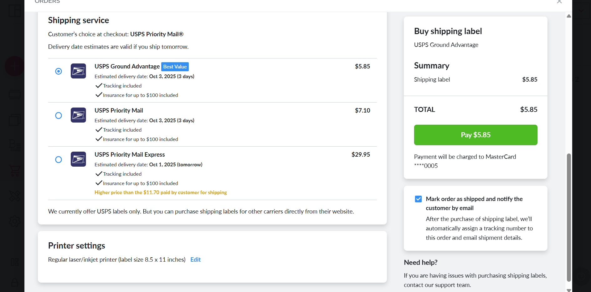 - In the Printer settings section, select your printer type to print a shipping label of the appropriate size: Regular laser (label size is 8.5 x 11 inches) or Label printer (label size is 4 x 6 inches).