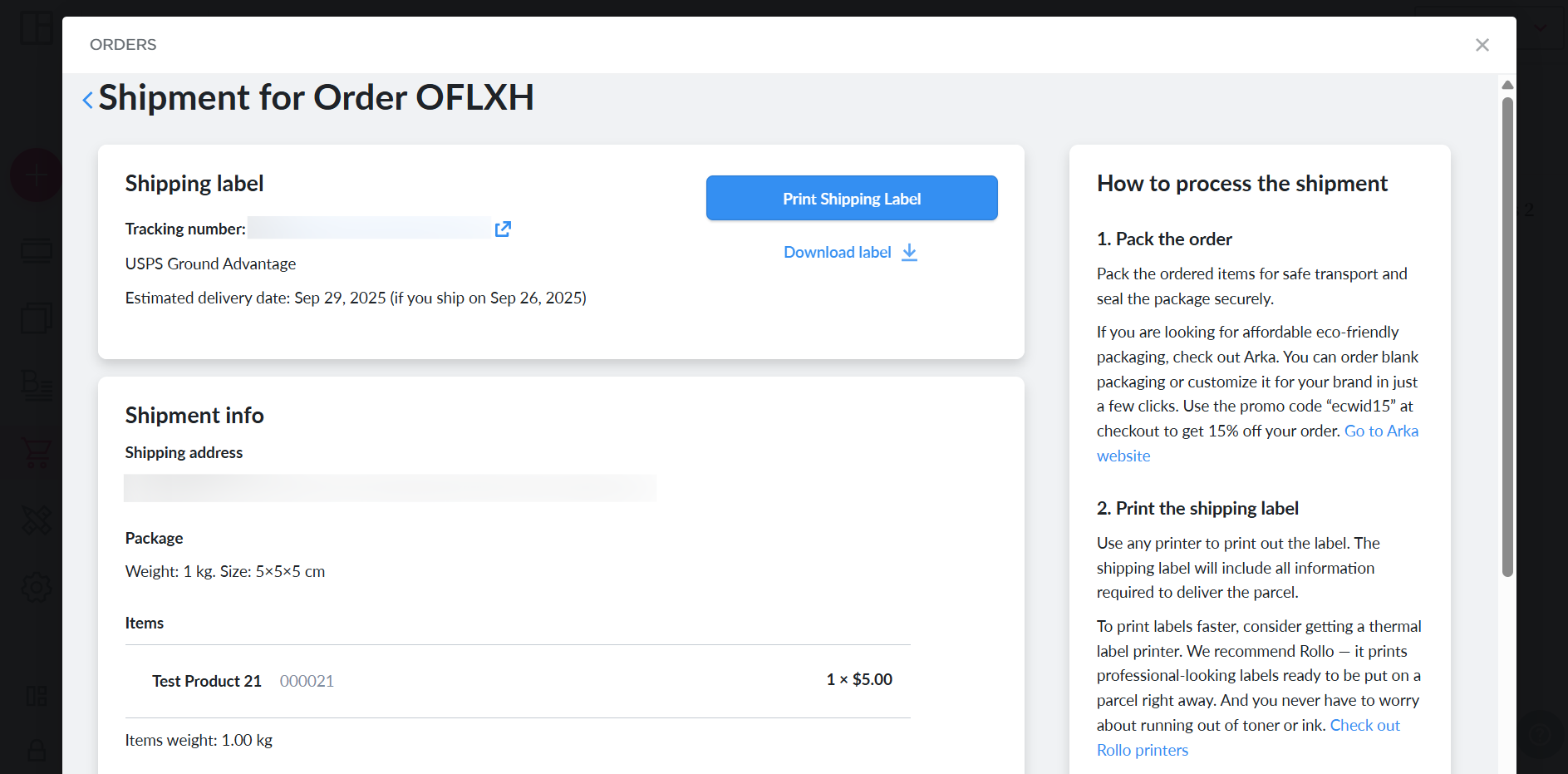 - Click Buy Shipping Label. If you don’t have a credit card connected to your store, you will be able to add one to buy shipping labels. Once the purchase is complete, you will see the shipping label details and a tracking number.