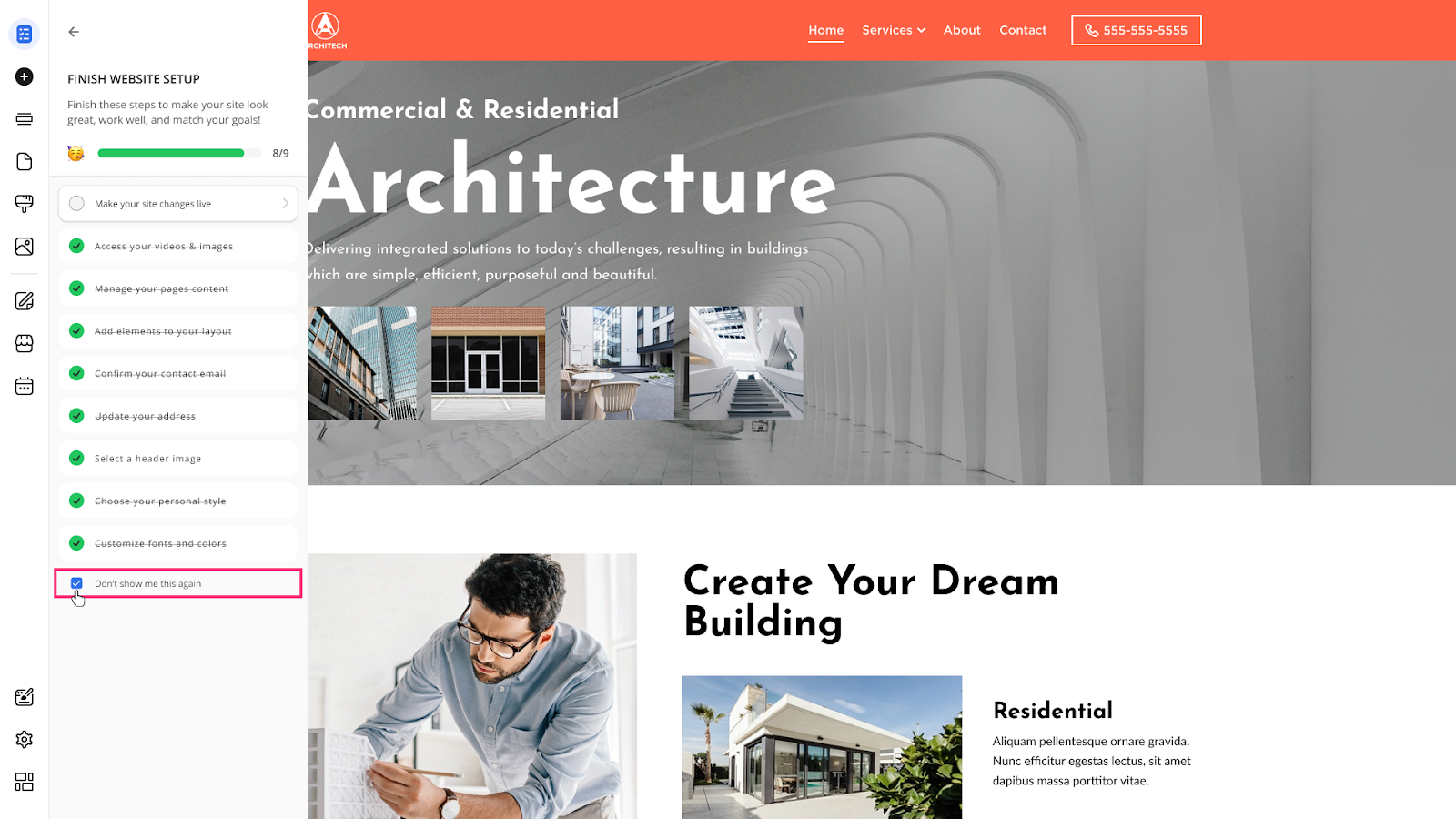 Please Note: The Select your header image, Choose your personal style, and Customize fonts and colors steps are marked as complete, because they were previously completed during Website Onboarding.