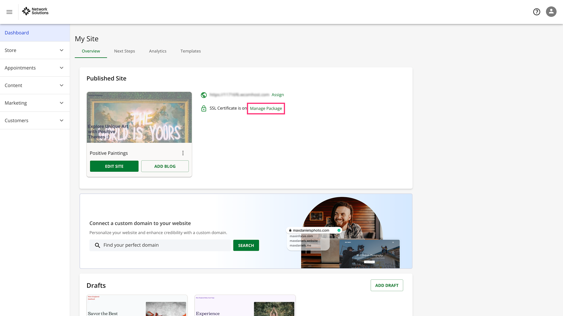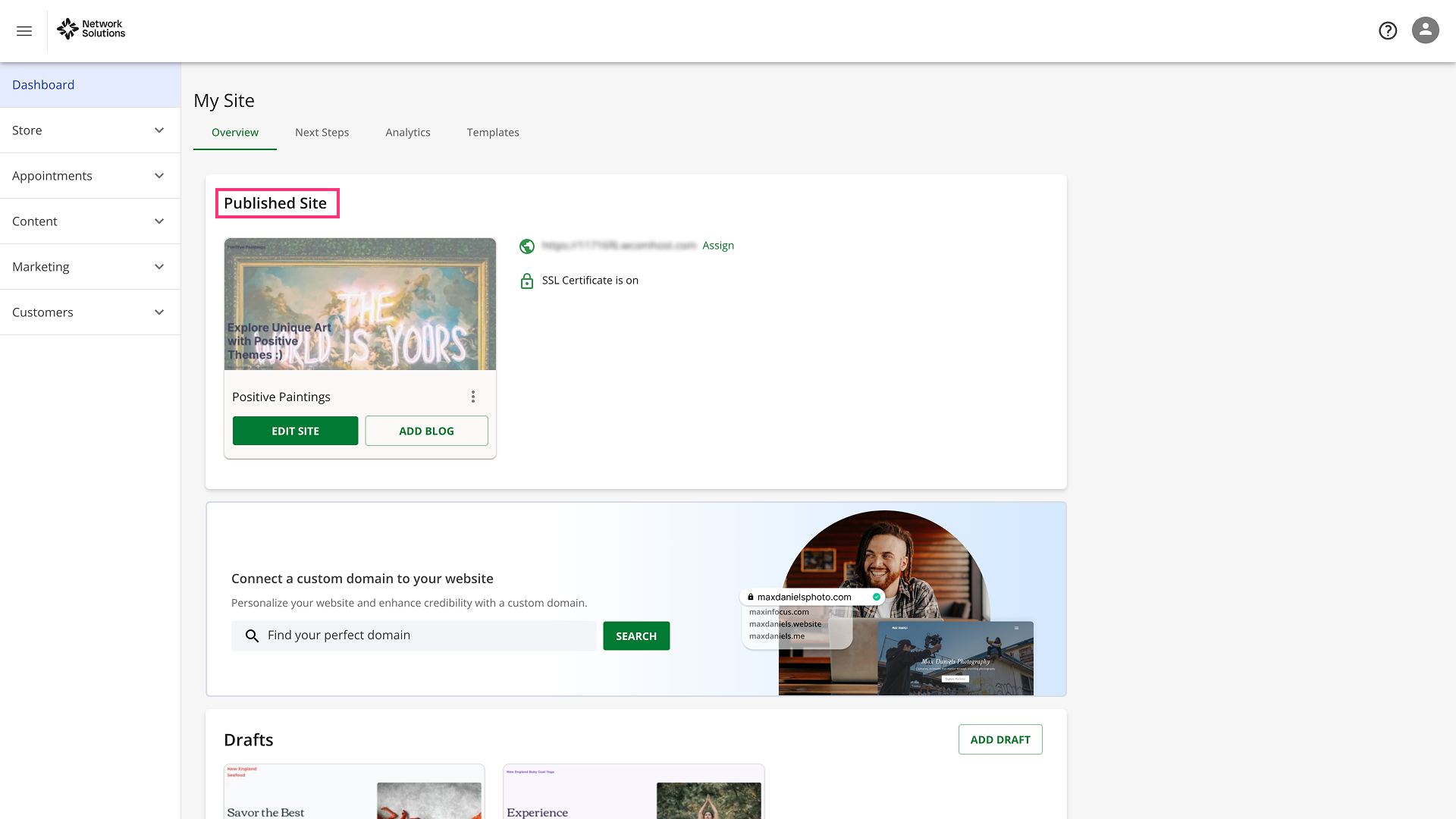 - Published Site: Contains published website and additional Site Information (domain name, and SSL information).