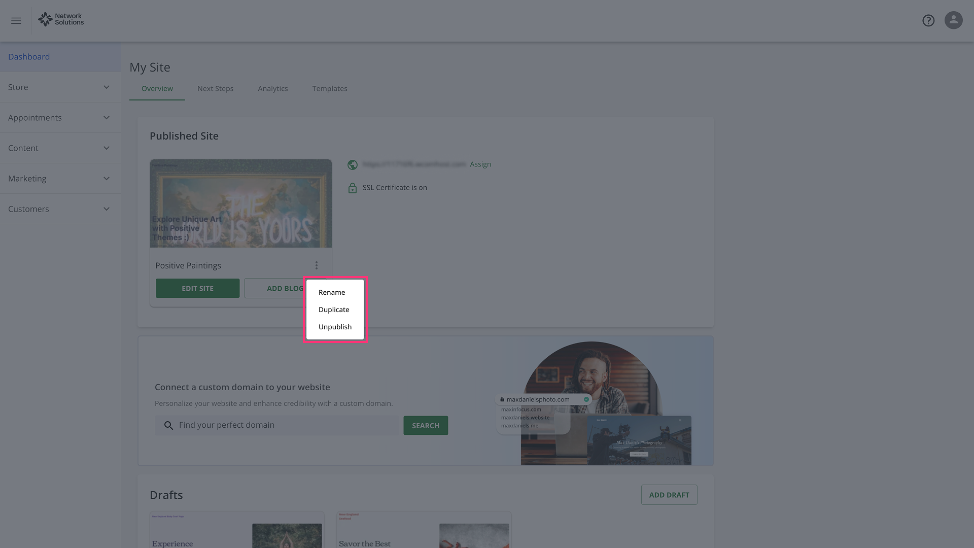- You can hover over the Options button (three vertical dots) to Rename, Duplicate, or Unpublish your Published Site: